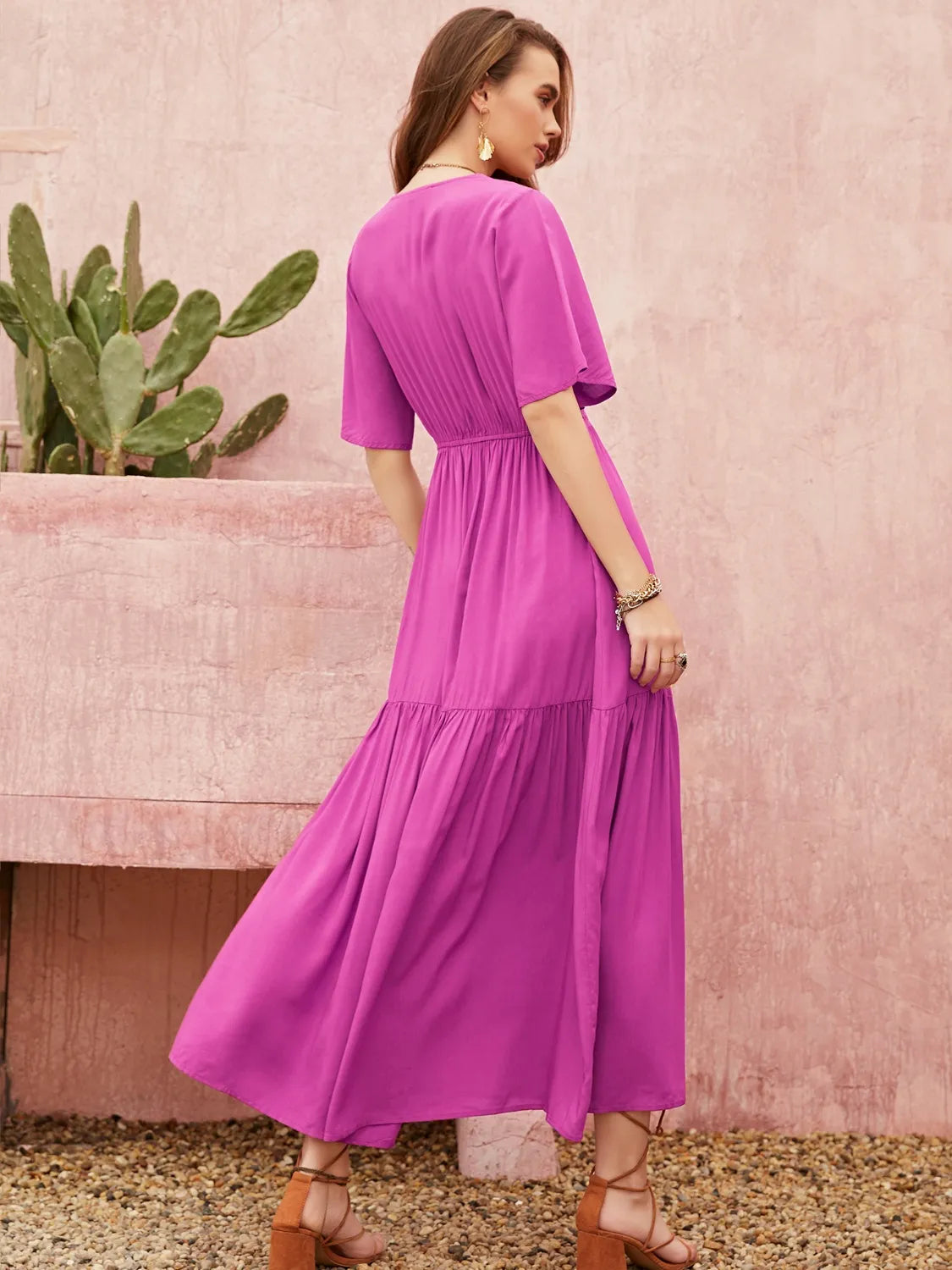 Lace Detail V-Neck Short Sleeve Midi Dress