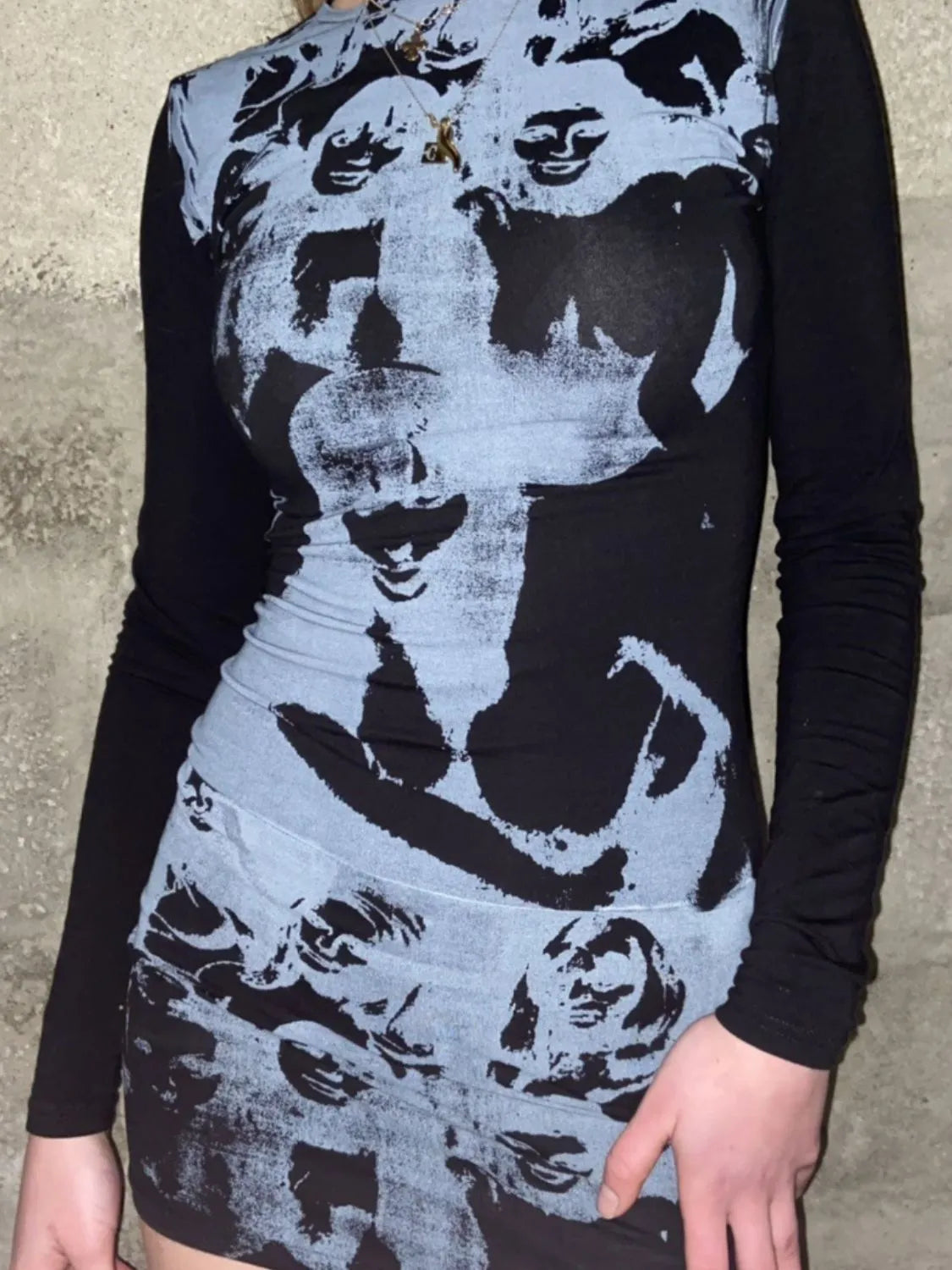 Home/All/Printed Round Neck Long Sleeve Mini Dress
