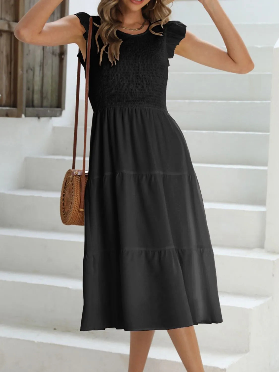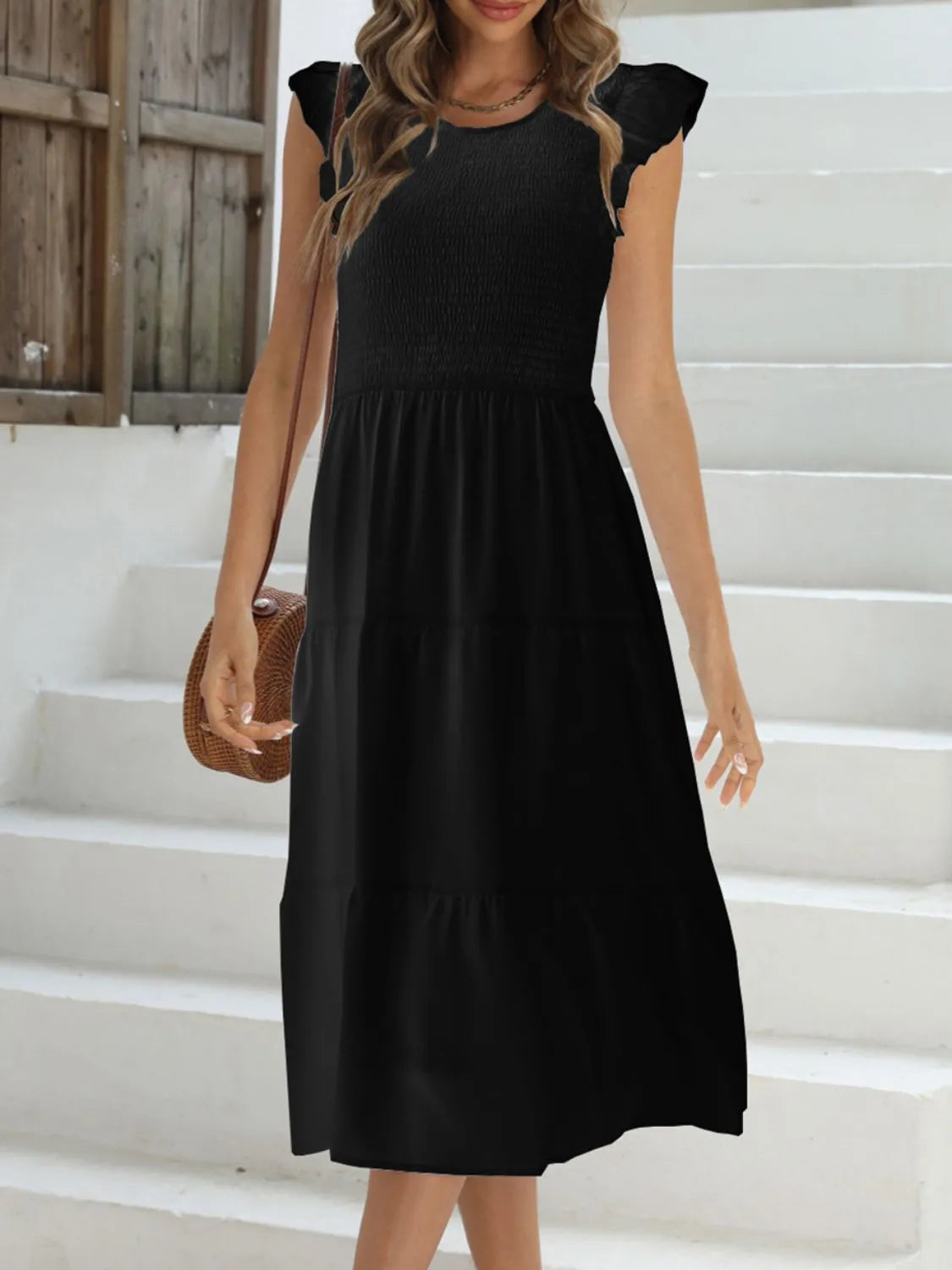 Home/All/Ruffled Round Neck Cap Sleeve Dress