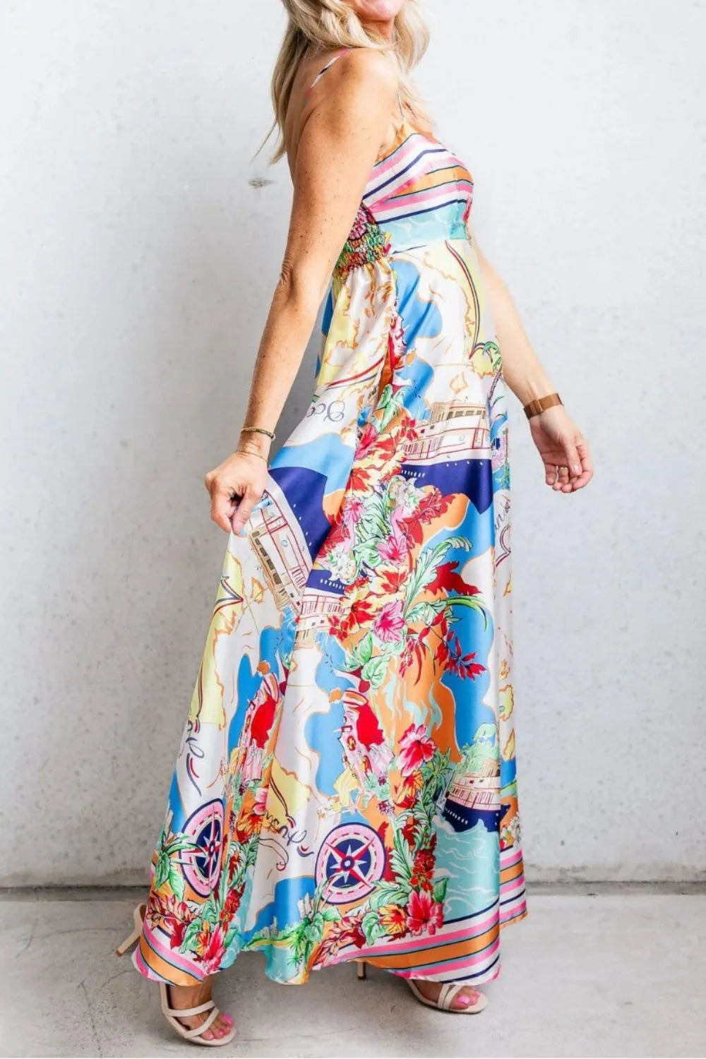 Smocked Back Printed Square Neck Maxi Cami Dress with Pockets