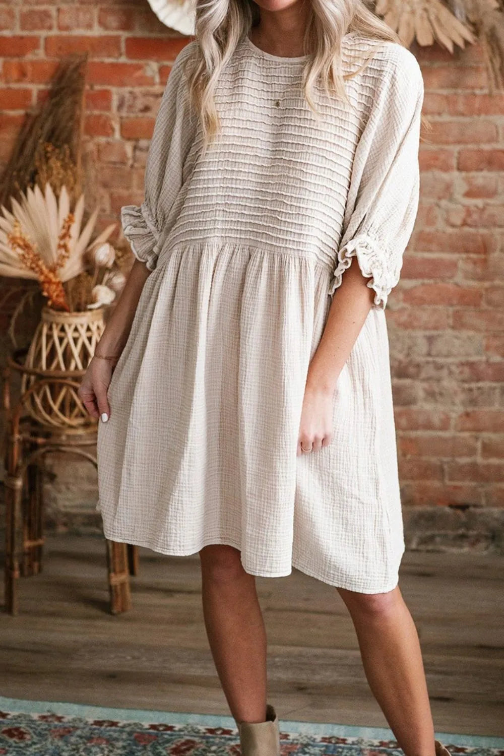 Textured Ruffled Puff Sleeve Loose Dress