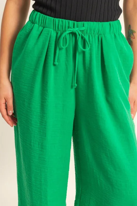 Achieve a chic and comfortable look with these elasticized waist wide leg pants. The elasticized waistband provides a flexible and easy fit for all-day comfort. The wide leg silhouette offers a stylish and on-trend look that is perfect for both casual and dressed-up occasions. Pair these pants with a tucked-in blouse and heels for a polished outfit, or with a basic tee and sneakers for a more relaxed vibe. Elevate your style with these versatile and flattering pants.