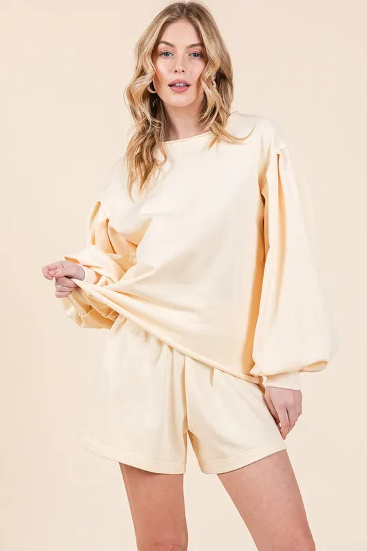 Stay cozy and stylish in this French terry sweatshirt and shorts set. The French terry fabric is soft and comfortable for all-day wear. The matching set creates a cohesive and effortlessly chic look. Perfect for lounging at home or running errands in style. Embrace comfort and fashion with this trendy sweatshirt and shorts set.