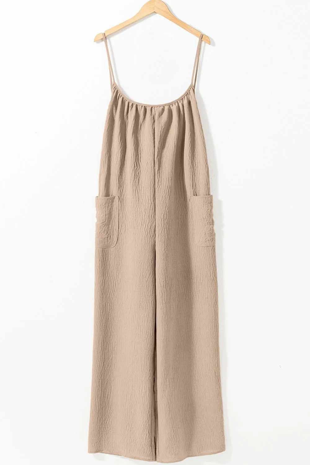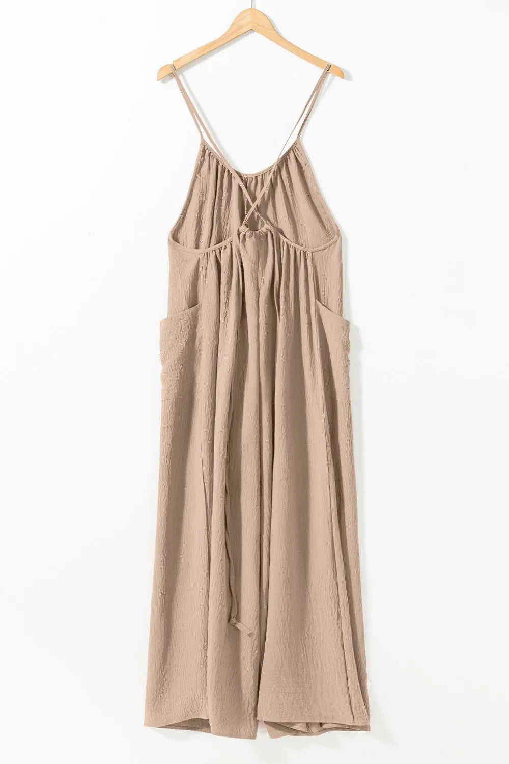 Home/Bottoms/Spaghetti Strap Waist Tie Wide Leg Jumpsuit with Pockets