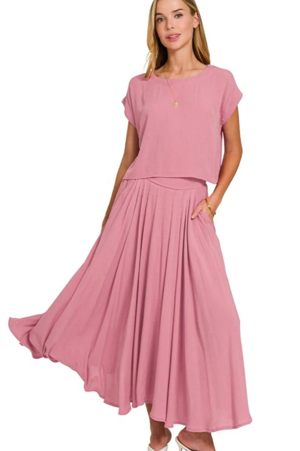 Zenana Woven Crinkle Gauze Crop Tee and Skirt Set