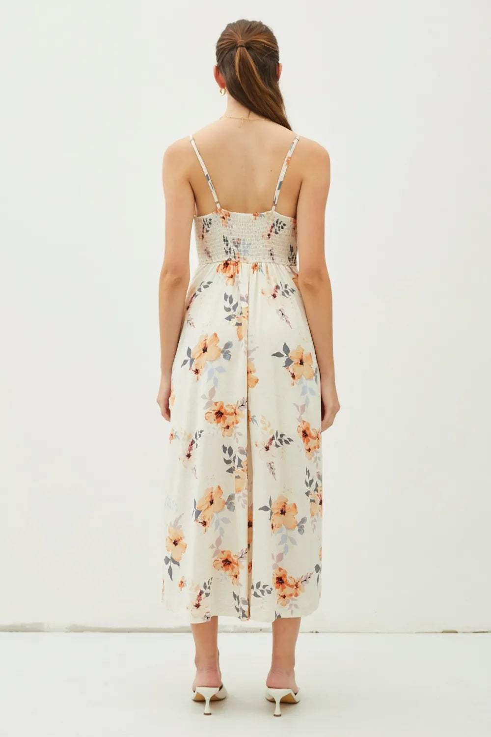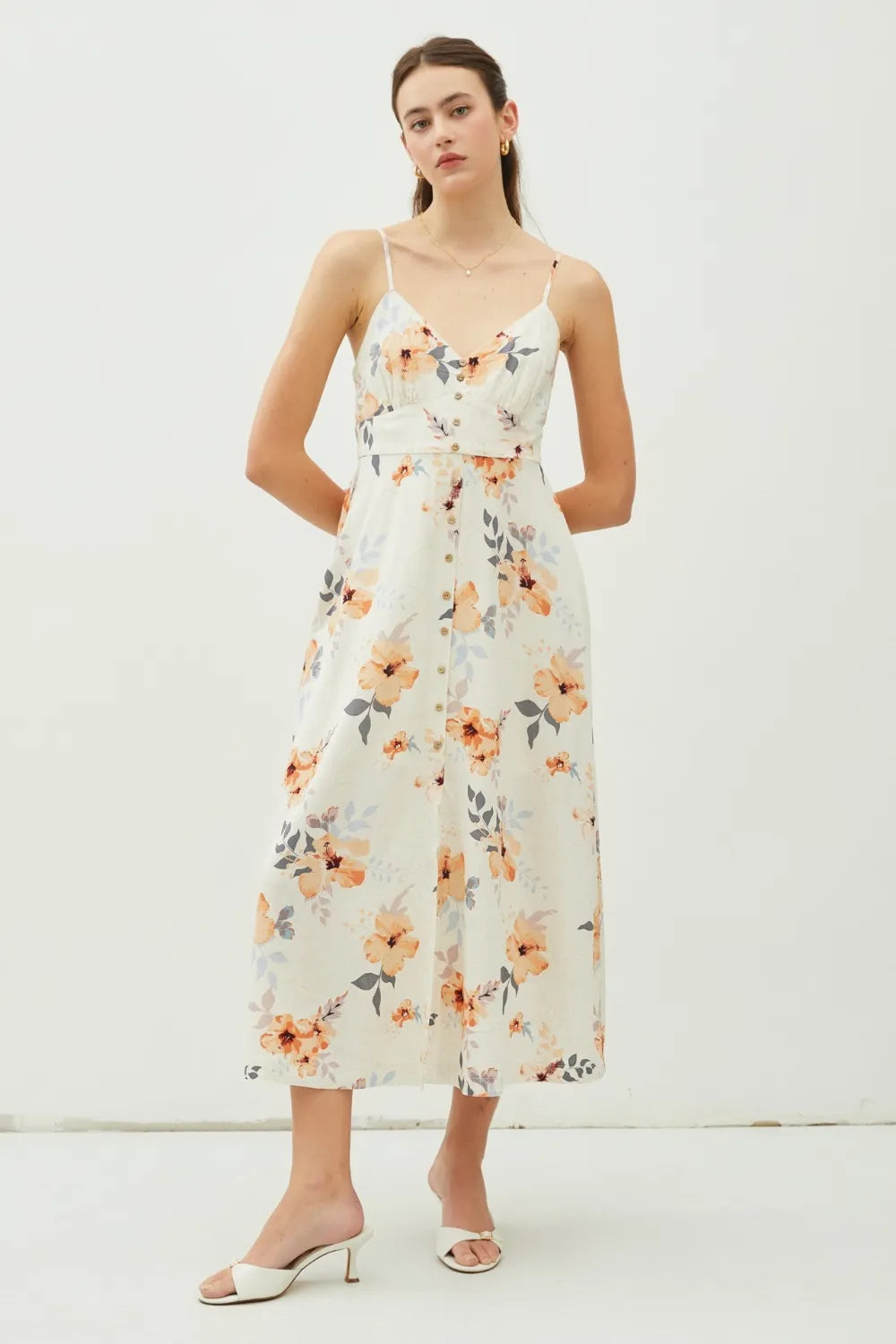 Introducing our Floral Button Down Cami Midi Dress, a charming and feminine choice for your wardrobe! This dress features a lovely floral print, a button-down front, and cami-style straps for a chic look. The midi length adds a touch of elegance, making it perfect for any occasion. Made from lightweight and flowy fabric, it offers both comfort and style. Select your favorite floral pattern to showcase your individual style. Elevate your look with this romantic and versatile midi dress that will effortlessly take you from day to evening events!