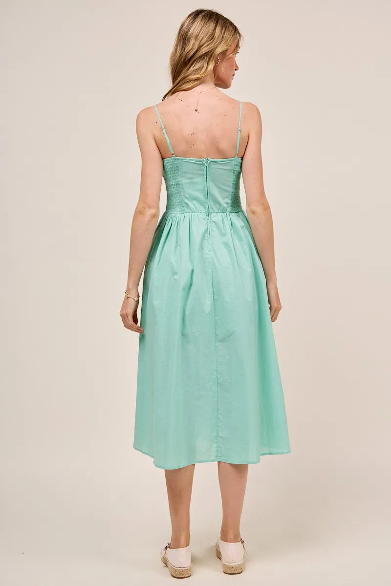 This stunning mint green midi dress features a beautifully smocked bodice that creates a flattering fit and comfortable stretch. The adjustable spaghetti straps ensure perfect sizing while the flowing skirt with side slit adds movement and elegance. Made from soft cotton blend fabric, this dress offers breathability and comfort for all-day wear. The fresh mint green color is perfect for spring and summer occasions, while the versatile design transitions seamlessly from casual daytime events to evening gatherings. The romantic feminine silhouette flatters all body types and the easy-care fabric maintains its shape and color wash after wash.