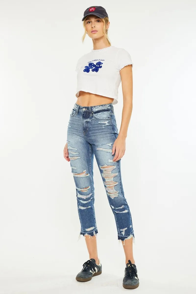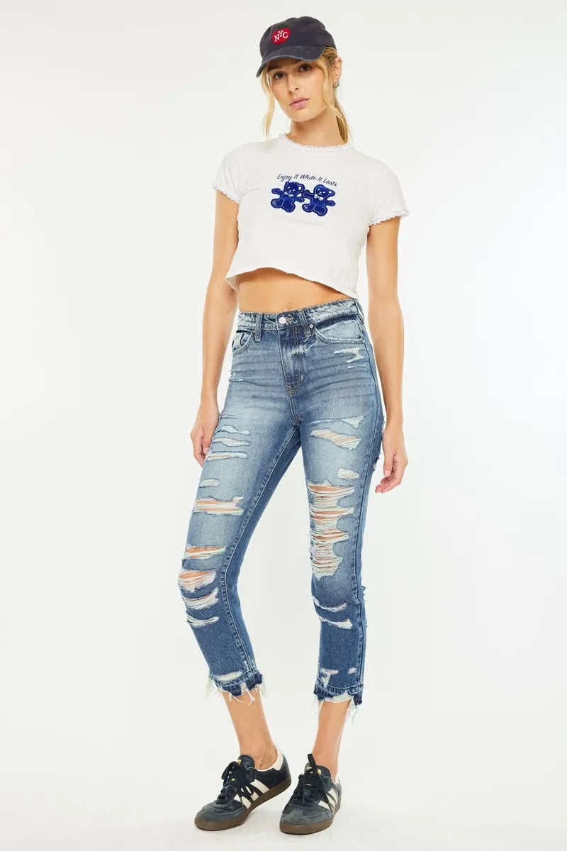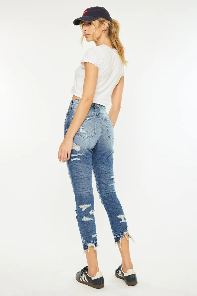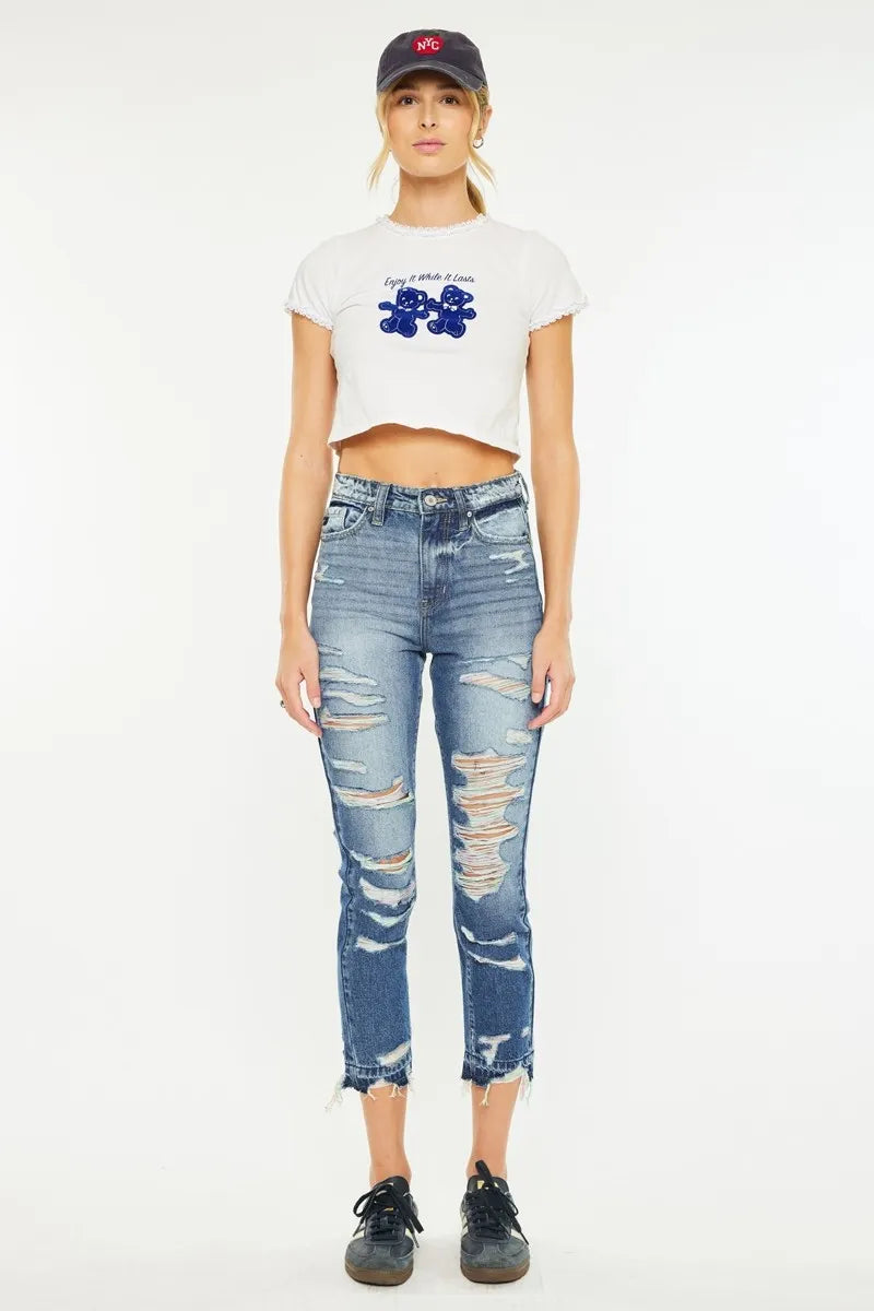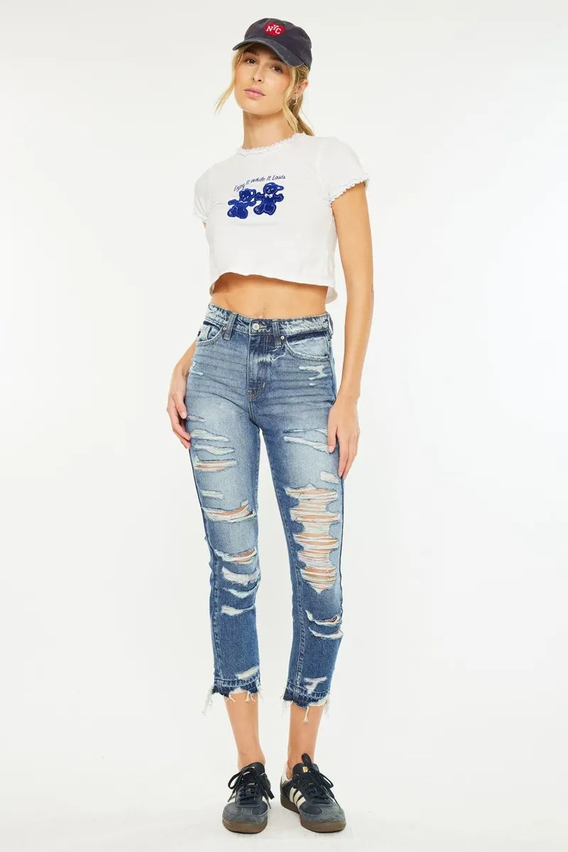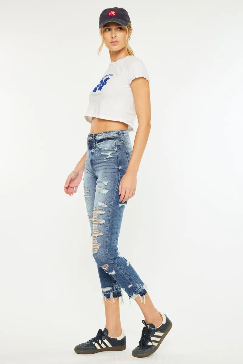 The Distressed High Rise Skinny Jeans are a versatile and chic option for any outfit. With a high rise waist and skinny fit, they offer a flattering and streamlined silhouette. The distressed details add a touch of edge and personality to these jeans, perfect for creating a casual yet stylish look. These jeans can be dressed up with heels or down with sneakers, making them a versatile and essential piece for your wardrobe.