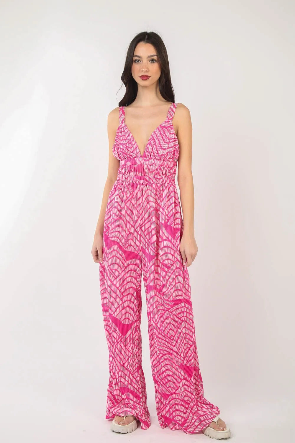 VERY J Printed Pleated Sleeveless Wide Leg Jumpsuit