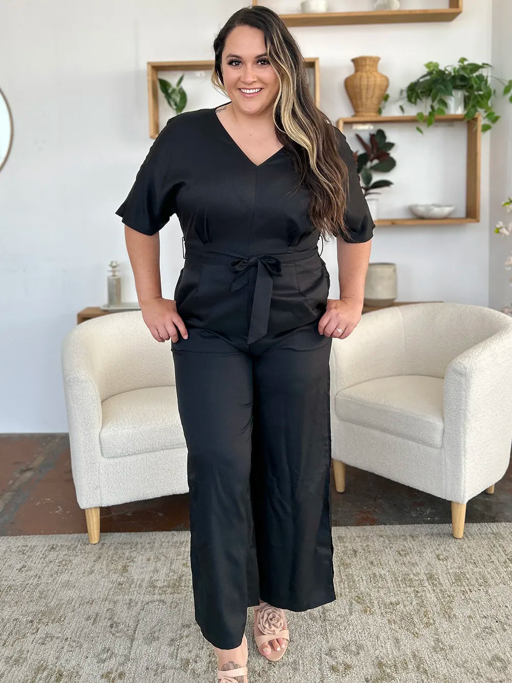 Double Take Full Size V-Neck Tied Side Slit Jumpsuit