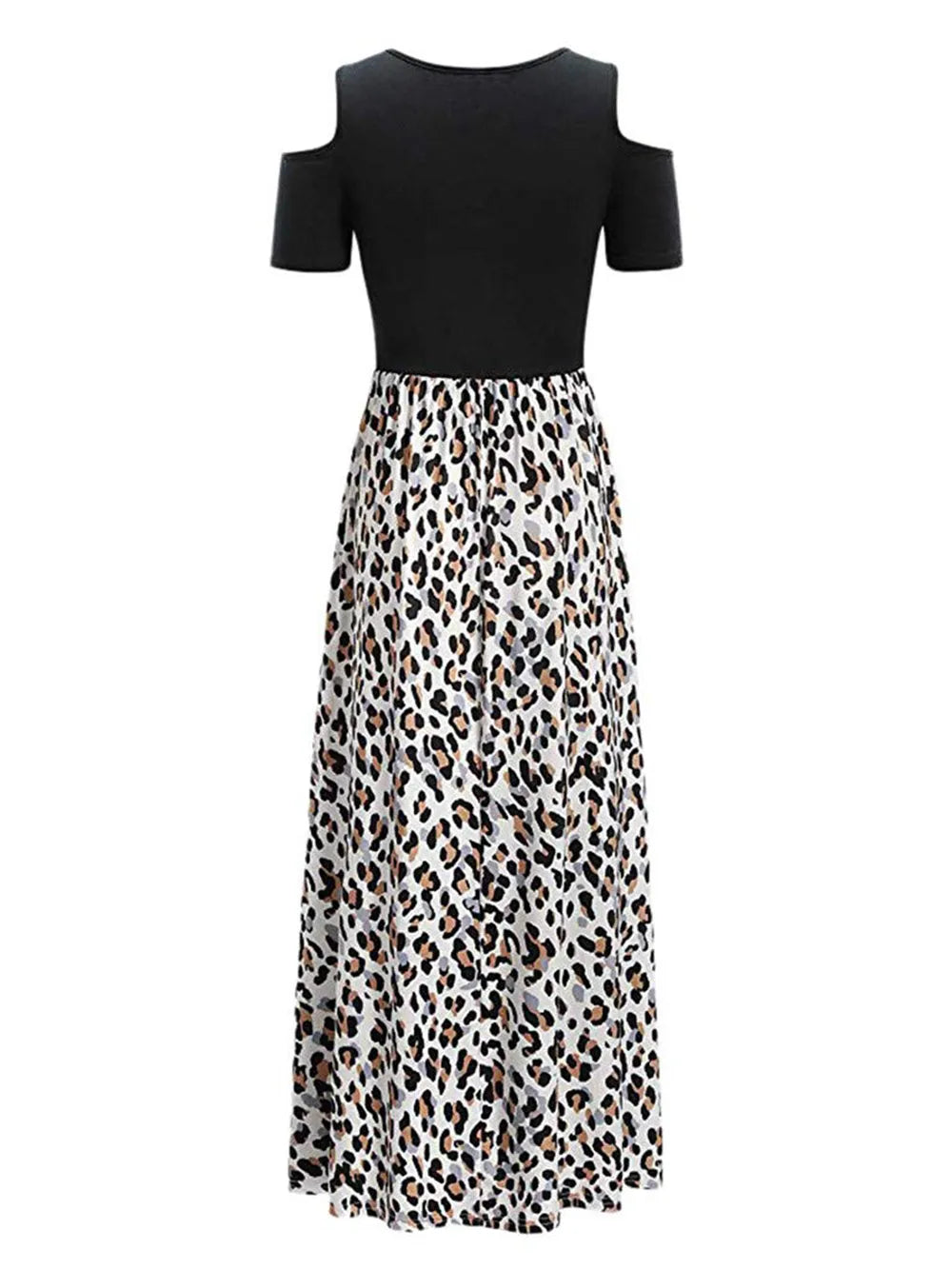 Home/Maxi Dresses/Leopard Round Neck Cold Shoulder Dress