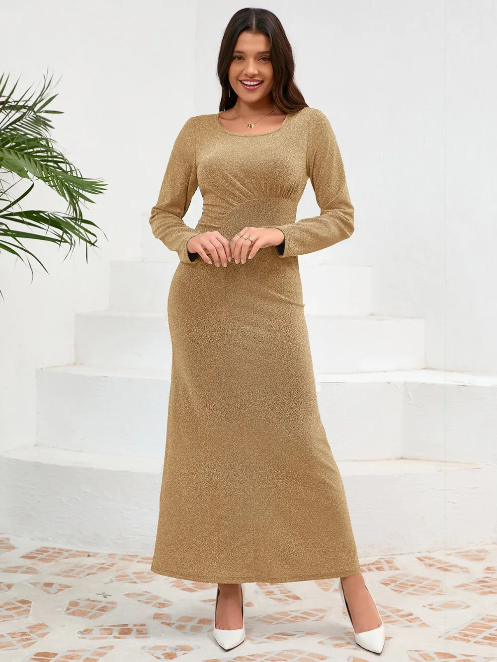 Home/Maxi Dresses/Ruched Round Neck Long Sleeve Dress