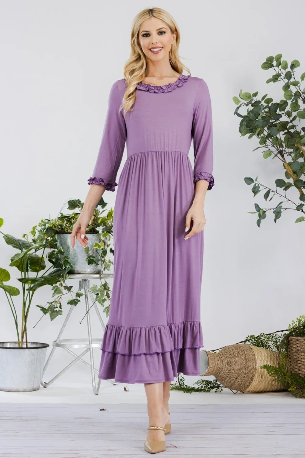 This classic dress has us completely enamored! The timeless A-line silhouette gracefully extends from the waist to flatter all figures by gently flaring over the hips. Complete with elegant 3/4 sleeves, a charming ruffle round neckline, convenient side pockets, and a delightful ruffle layered hemline, this dress is truly perfection for any occasion.
