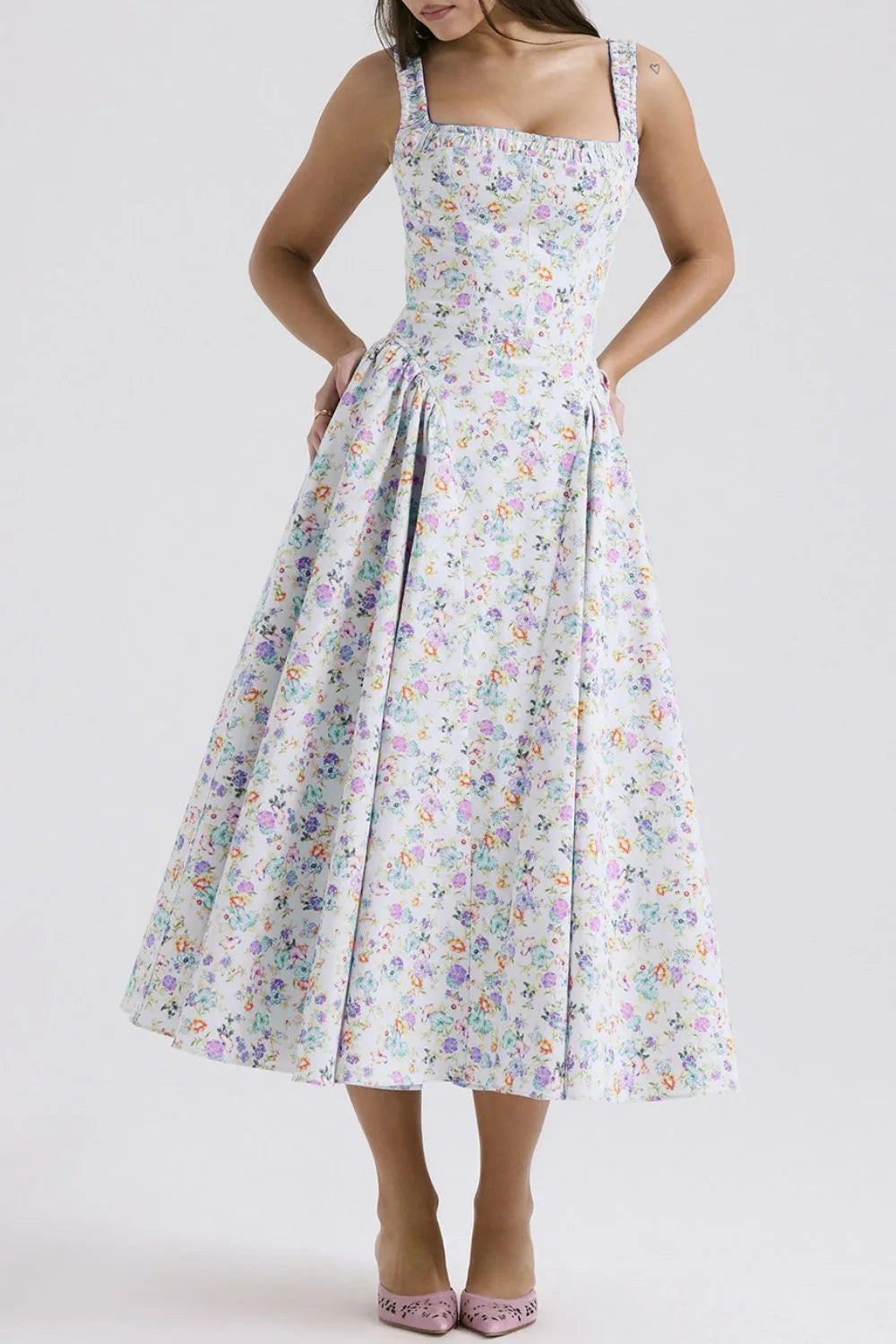 Floral Square Neck Wide Strap Midi Dress