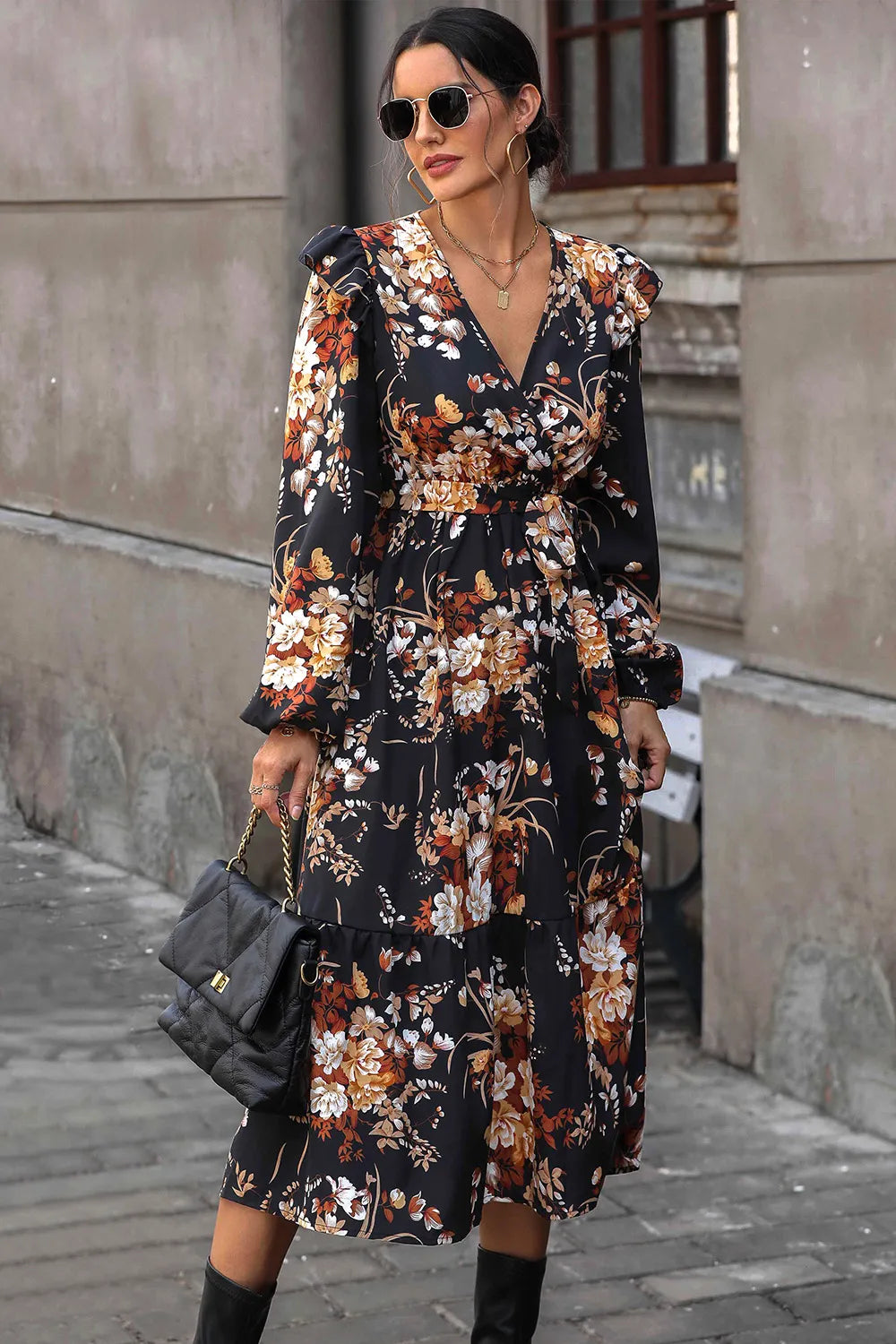 Perfee Floral Surplice Tie Front Ruffle Hem Midi Dress
