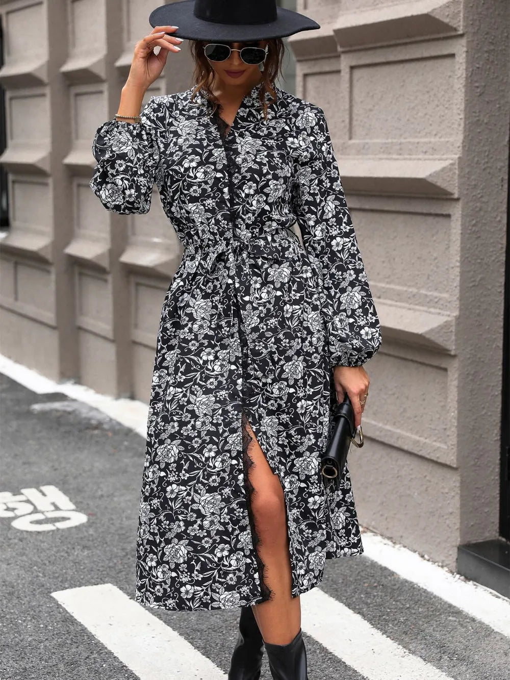 Home/Midi & Mini Dresses/Perfee Lace Detail Printed Long Sleeve Midi Dress