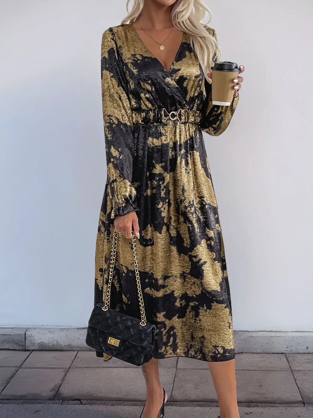 Perfee Printed Surplice Long Sleeve Midi Dress
