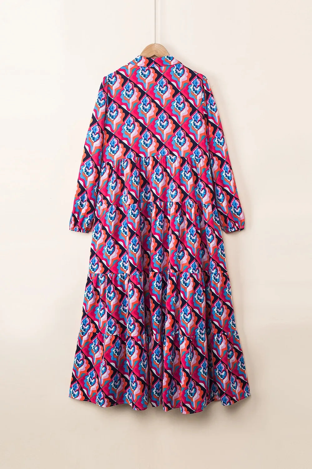 Home/Midi & Mini Dresses/Printed Collared Neck Long Sleeve Midi Dress