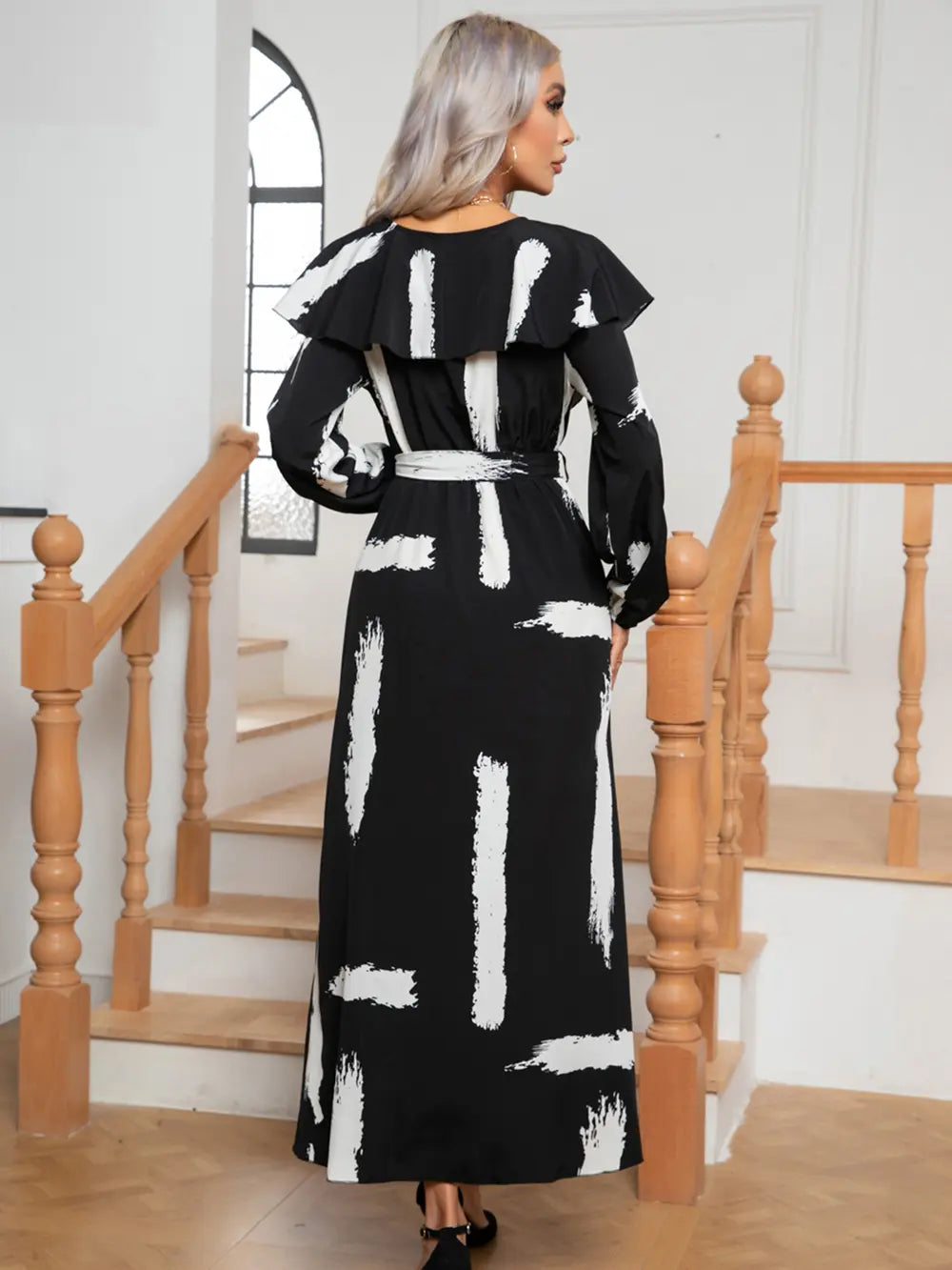 Printed Tie Front Ruffle Trim Long Sleeve Dress