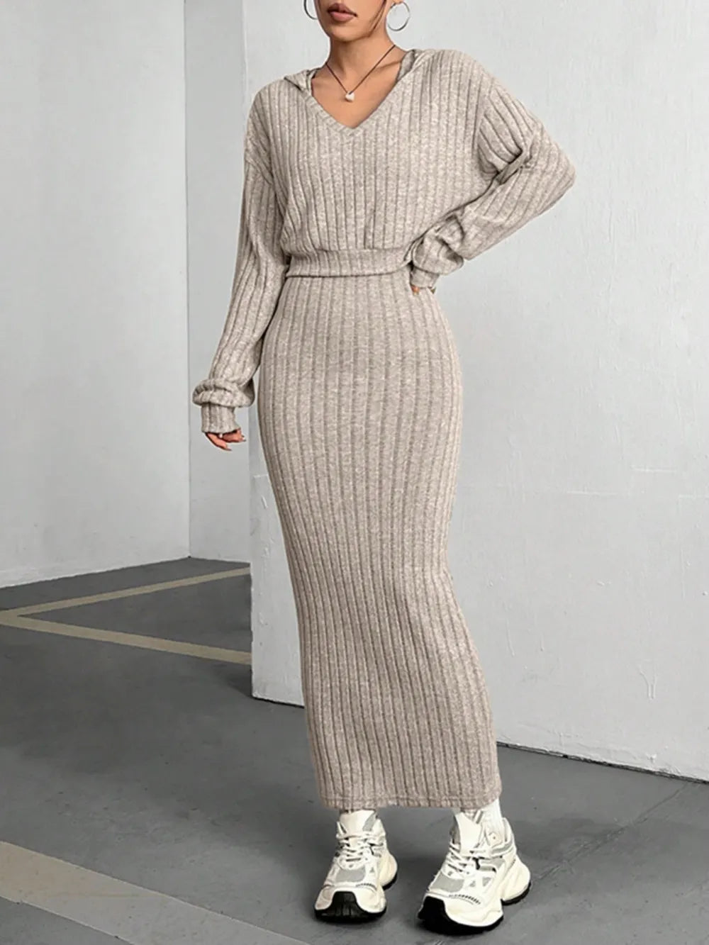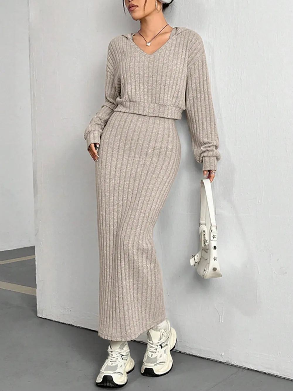 Home/Midi & Mini Dresses/Ribbed Cropped Hooded Top and V-Neck Tank Dress Set