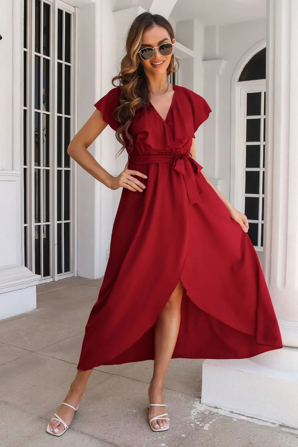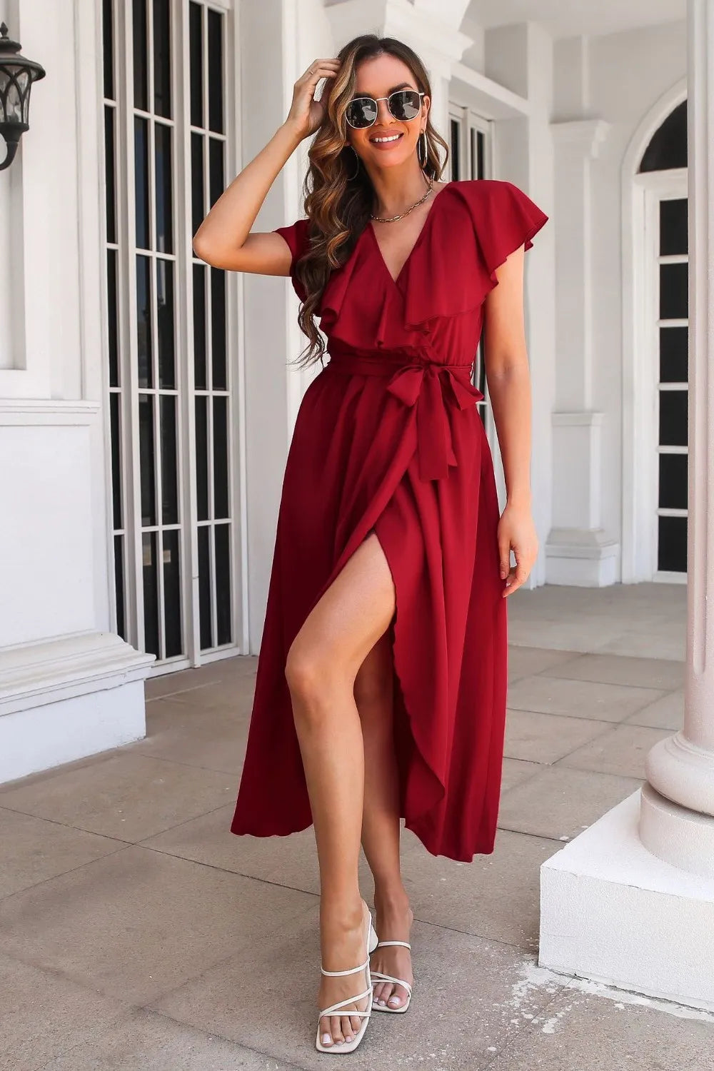 Ruffled Surplice Tie Waist Slit Midi Dress