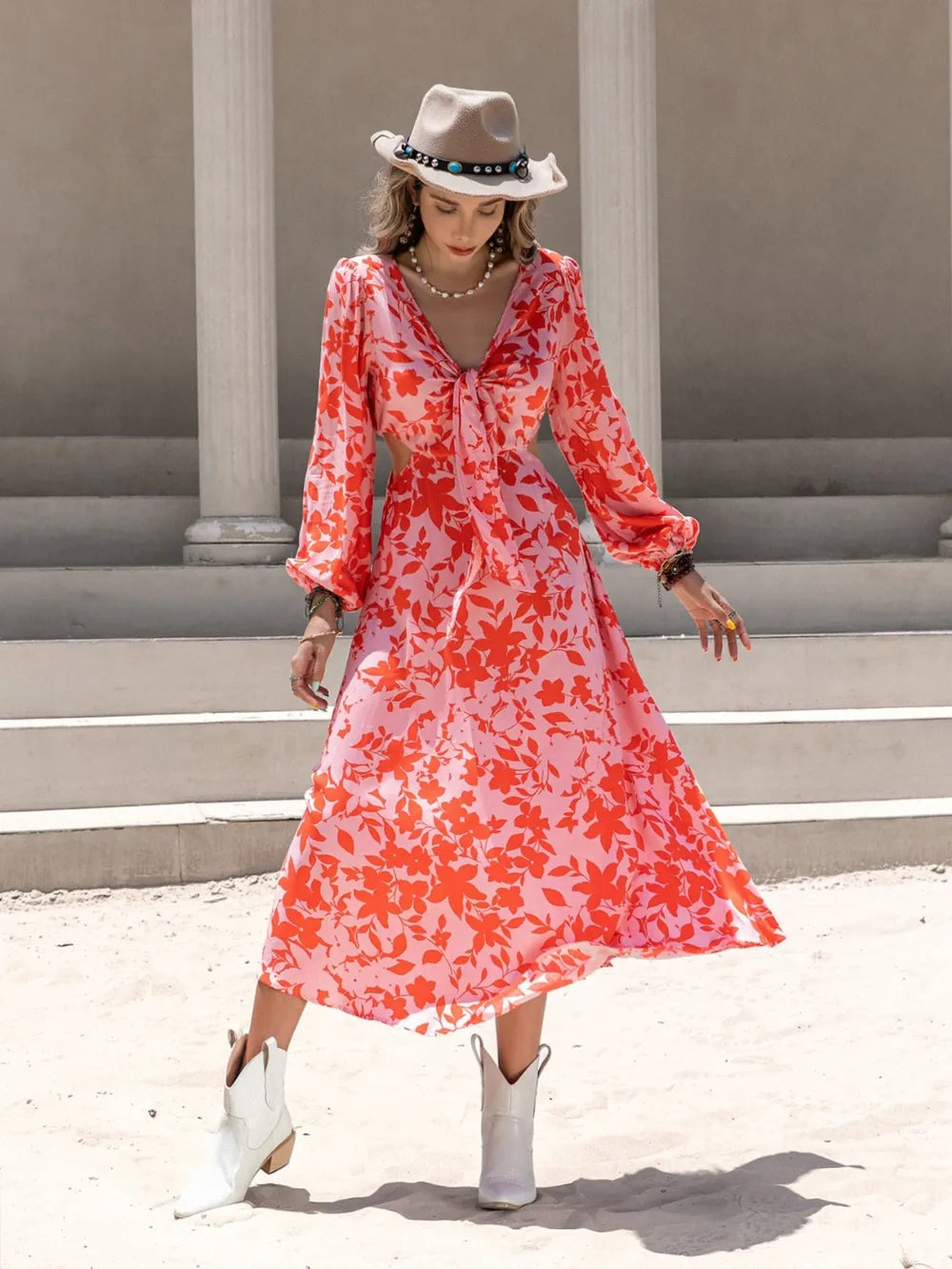 Home/Midi & Mini Dresses/Tied Cutout Printed Long Sleeve Midi Dress