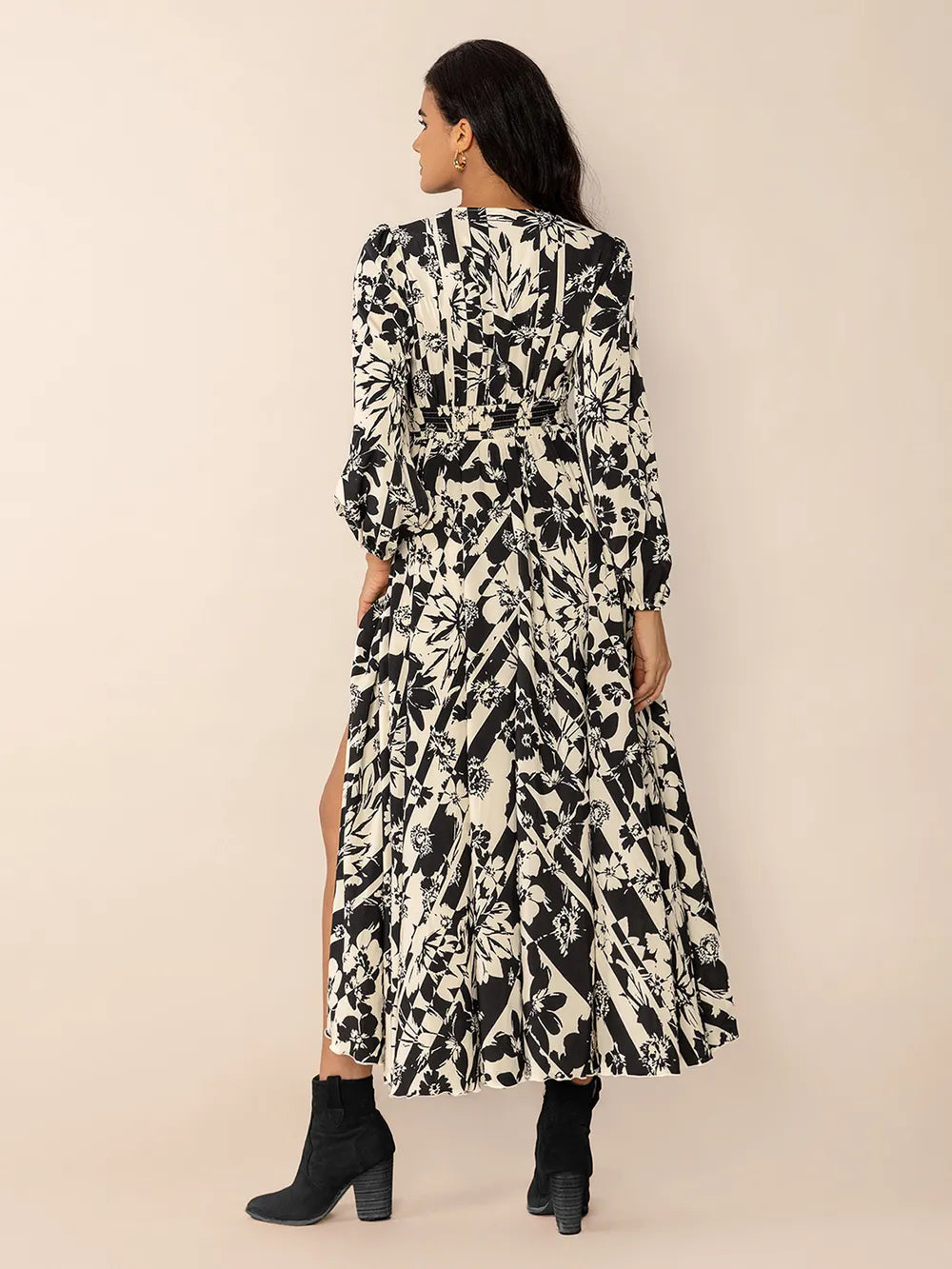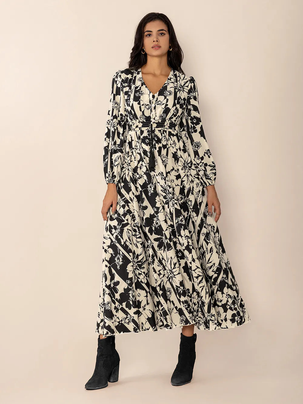Tied Printed V-Neck Long Sleeve Midi Dress