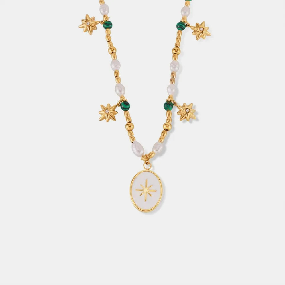 - Material: Freshwater pearl, 18K gold-plated, Titanium steel, Malachite, Drip Oil