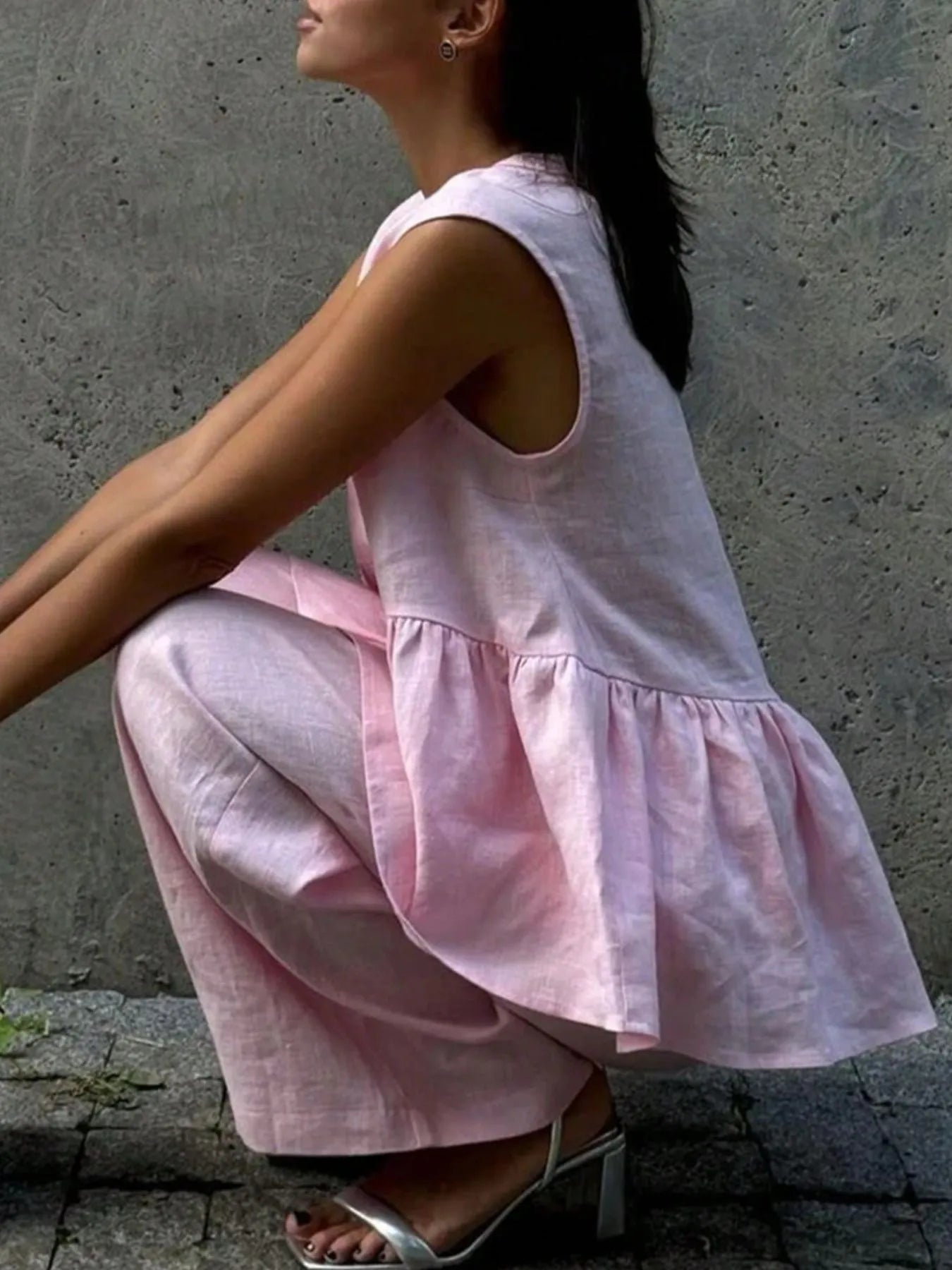 This elegant Pink Linen Button Down Peplum Vest and Wide Leg Pants Set features a sophisticated two-piece design perfect for casual and semi-formal occasions. The sleeveless vest showcases a flattering V-neckline with button-down front closure and a feminine peplum waist that creates a flattering silhouette. Paired with matching wide-leg palazzo pants, this set offers ultimate comfort and style. Crafted from breathable linen-blend fabric in a soft pink hue, it provides excellent airflow and comfort for all-day wear. The relaxed fit and flowy design make it ideal for spring and summer styling, while the coordinated set ensures effortless outfit coordination. Perfect for brunches, casual meetings, or weekend outings.