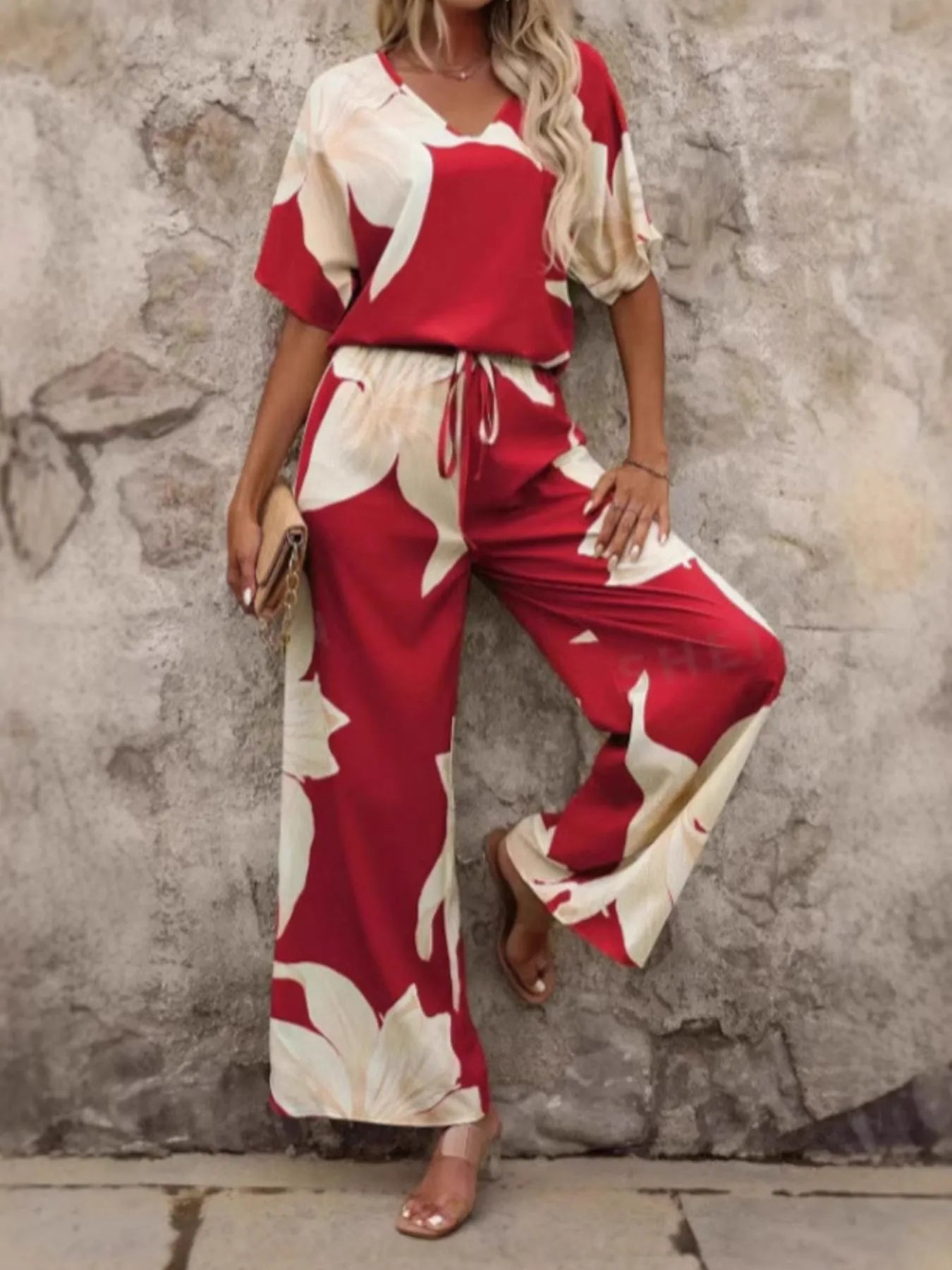 Home/Trousers & Pants/Printed V-Neck Top and Pants Set