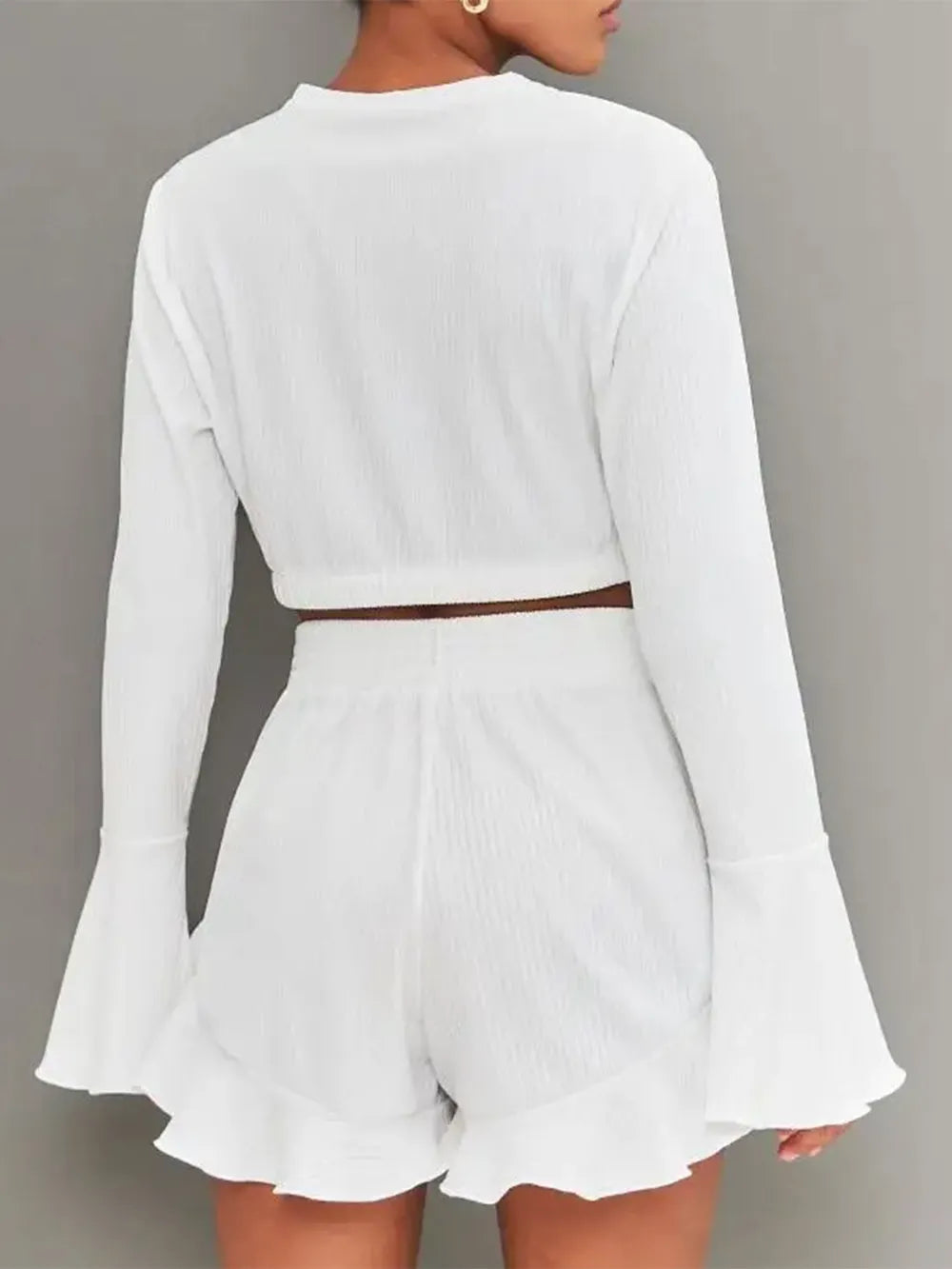 Round Neck Long Sleeve Top and Ruffled Shorts Set