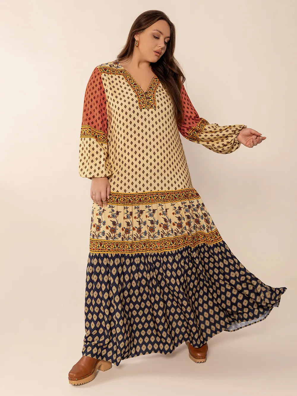 Plus Size Printed V-Neck Long Sleeve Maxi Dress