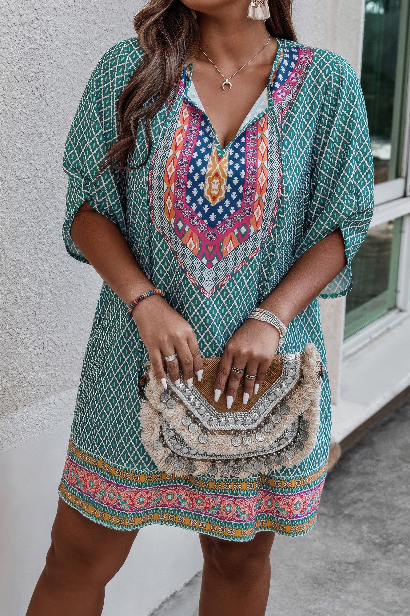 Plus Size V Neck Printed Loose Fit Midi Dress