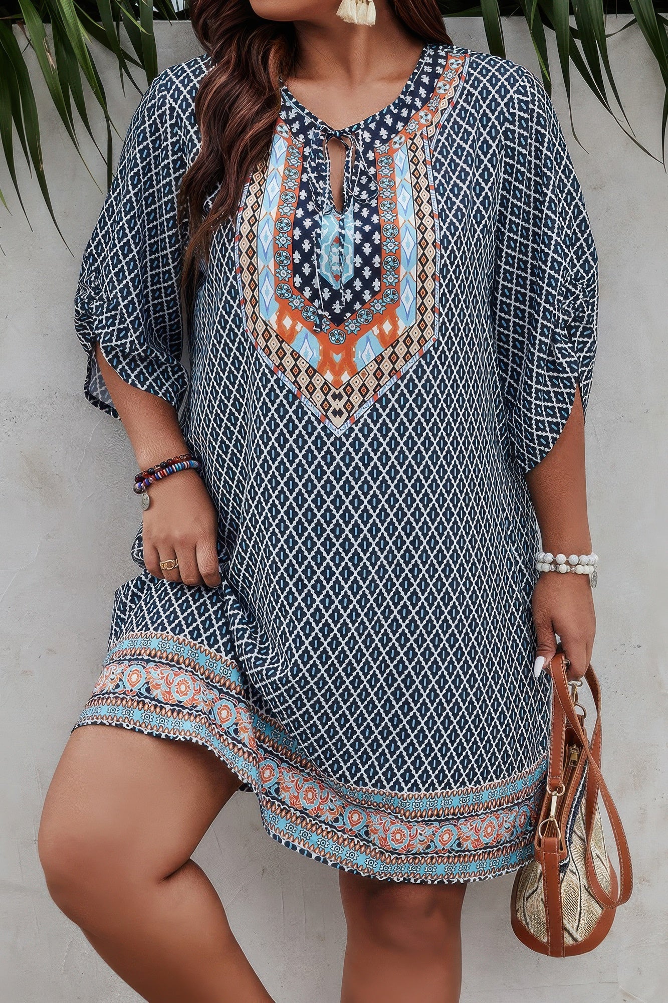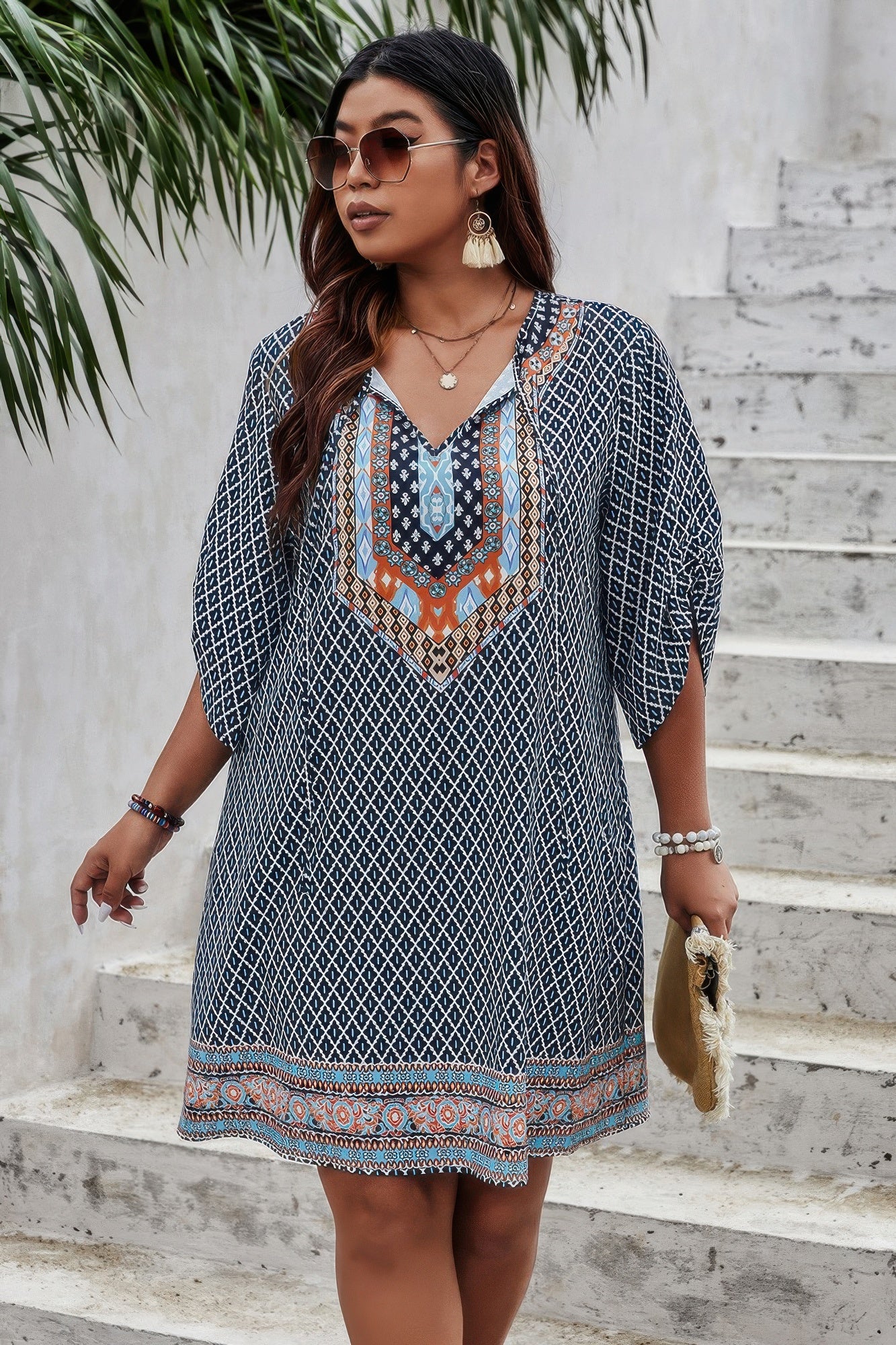 Home/Plus Dresses & Skirts/Plus Size V Neck Printed Loose Fit Midi Dress