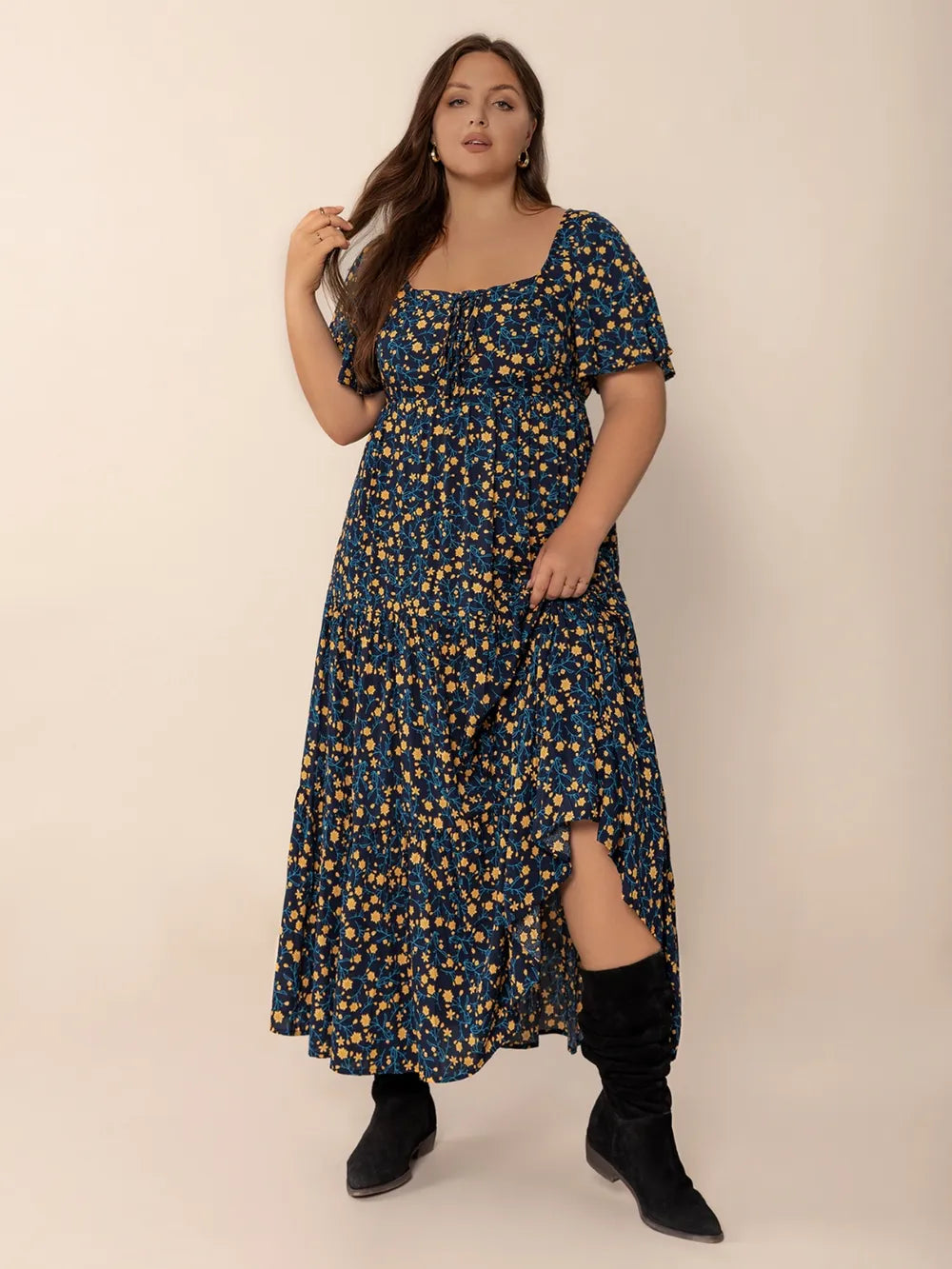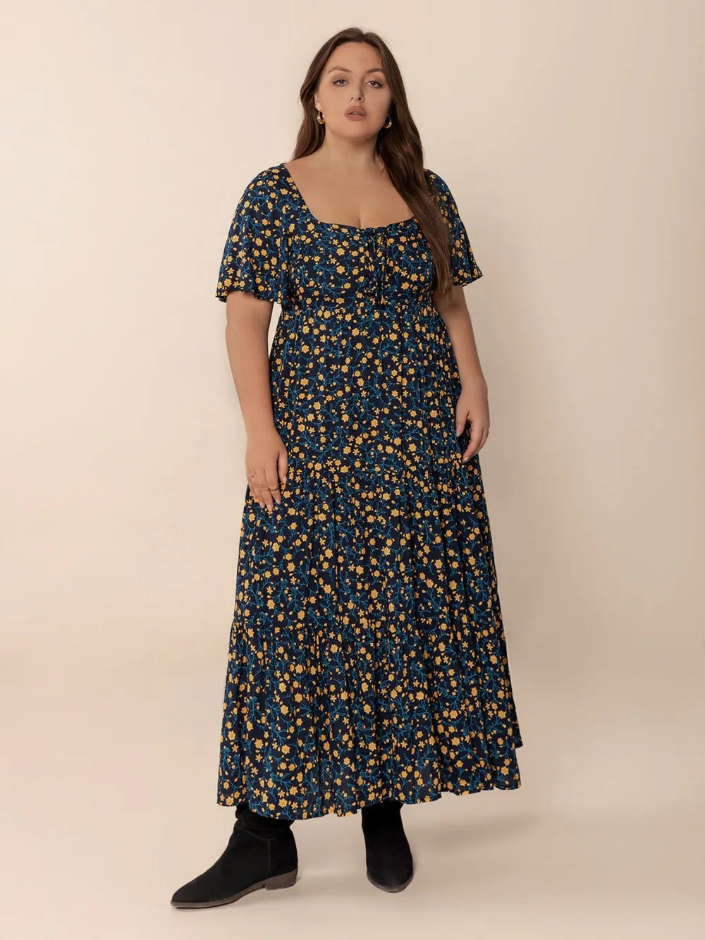 Plus Size Printed Short Sleeve Slit Tiered Maxi Dress