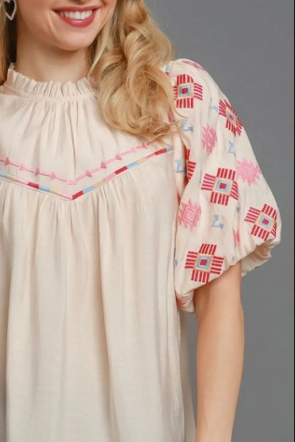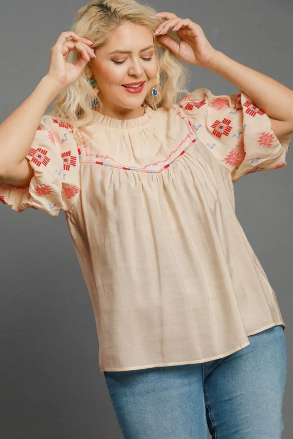 Umgee Full Size Embroidered Puff Sleeve Mock Neck Top Plus Size