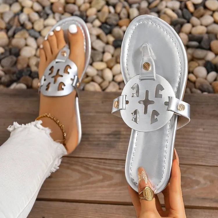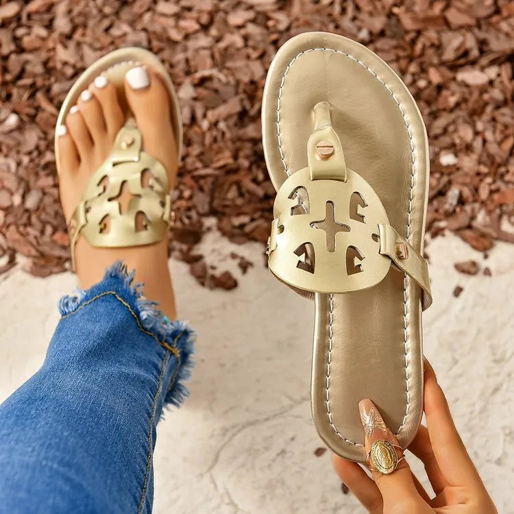 These elegant sandals feature a sophisticated medallion cut-out design in a lustrous gold finish. The thong-style construction offers easy wear while the flat sole ensures all-day comfort. Made with high-quality synthetic materials, these sandals combine style with practicality. The cushioned footbed provides excellent support, while the decorative hardware adds a touch of luxury. Perfect for casual outings or beach days, these sandals pair beautifully with both casual and dressy summer outfits. The durable construction and timeless design make these sandals a versatile addition to any summer wardrobe.