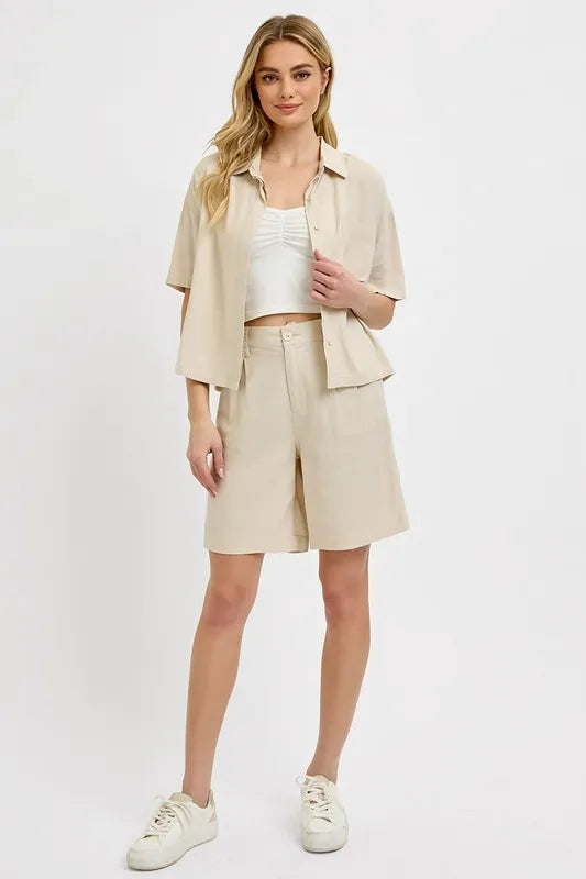 The High Rise Pleated Front Shorts offer a polished and sophisticated look with their pleated front detailing. These shorts sit high on the waist for a flattering fit and stylish silhouette. Perfect for achieving a chic and put-together ensemble, these shorts add a touch of elegance to your summer wardrobe.