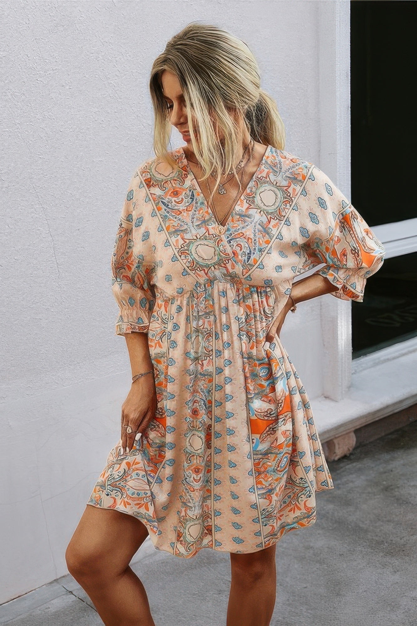 Boho Print Wrap Neck Tie Back Pleated Hem Dress
