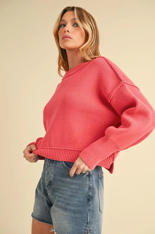 Aemi+Co Ribbed Hem Exposed Seam Round Neck Sweater