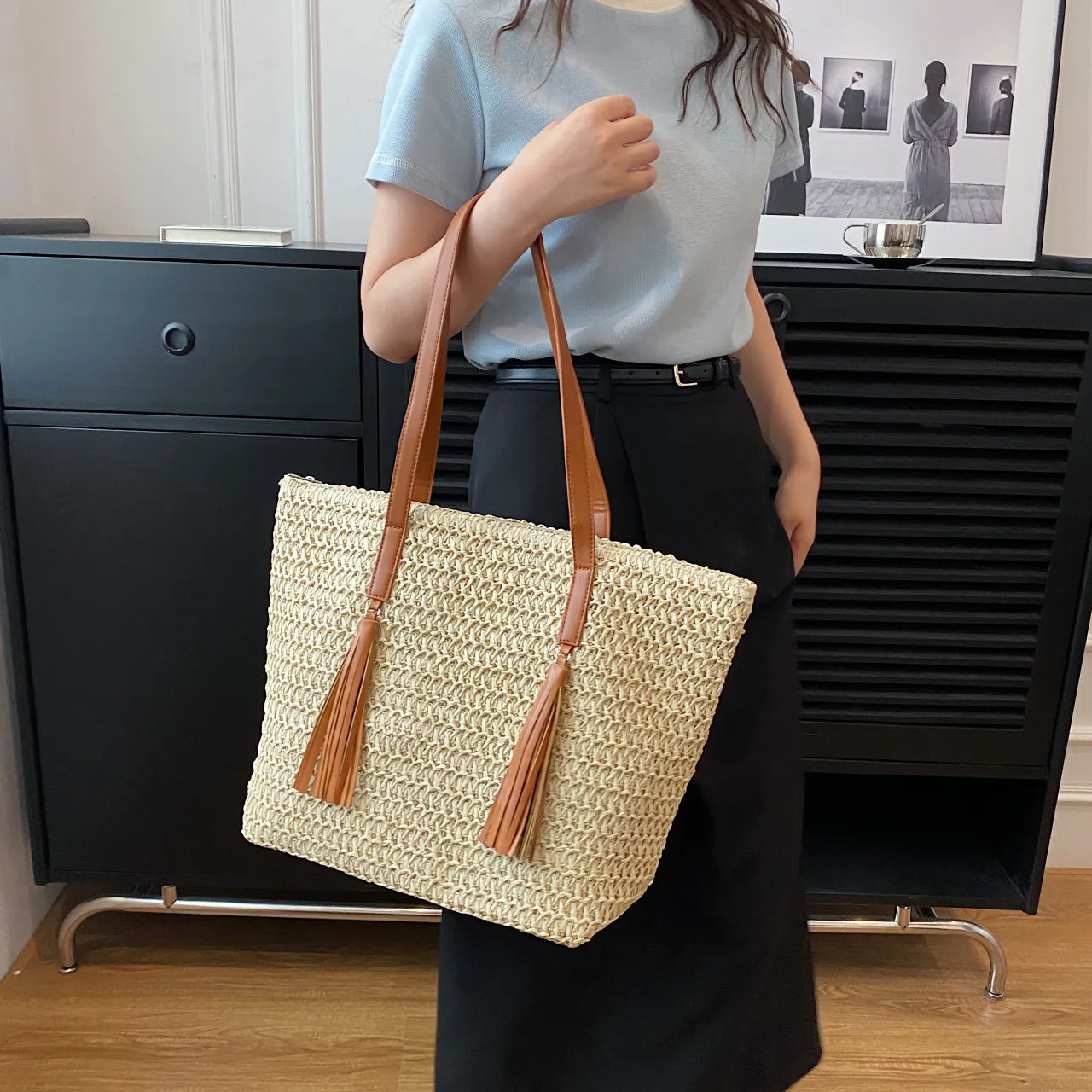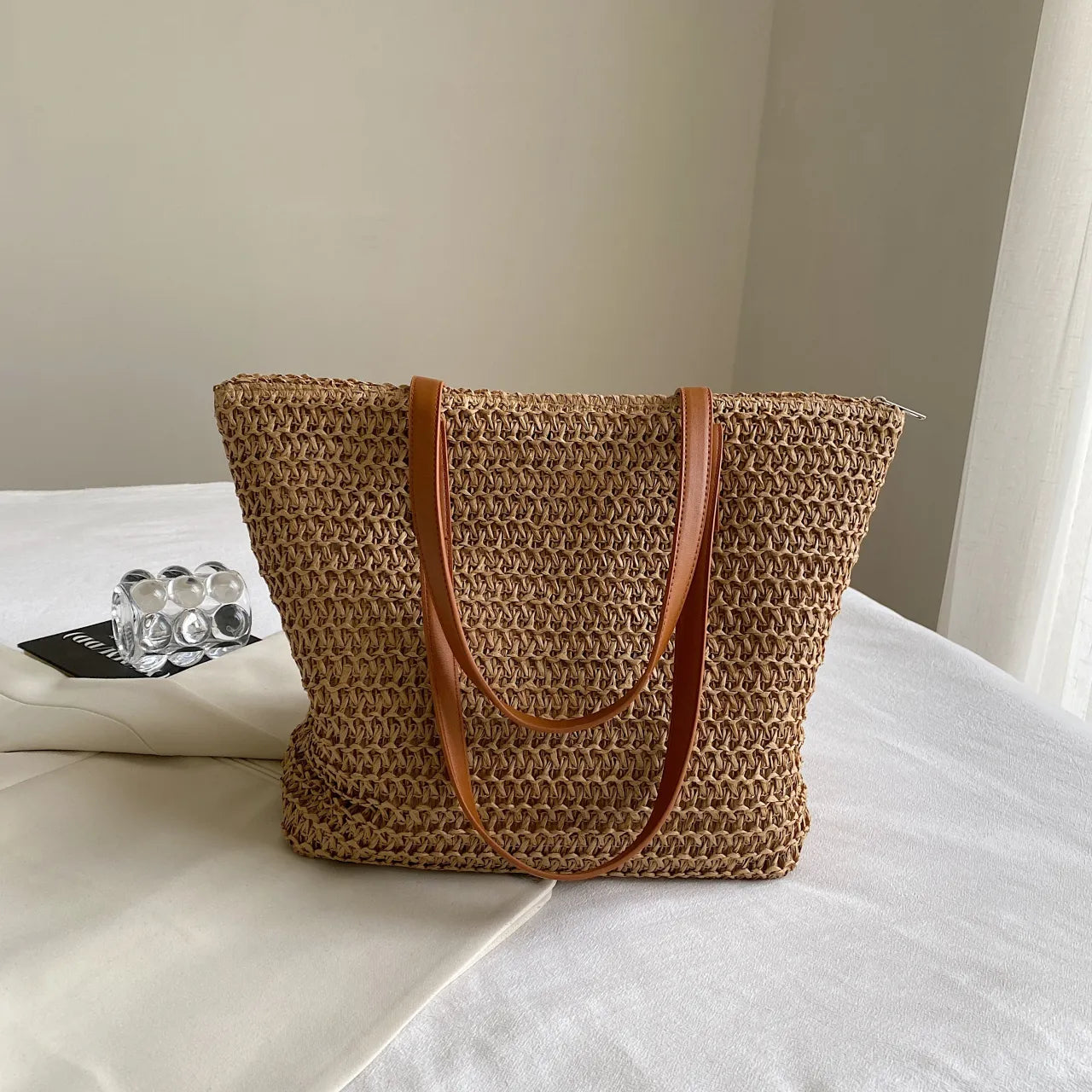 Home/Tote Bags/Woven Straw Tote Bag with Leather Handles
