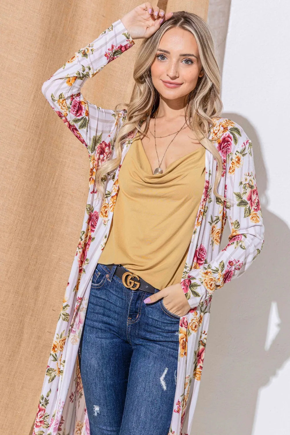 Home/Women Trench Coats/And The Why Floral Kimono Open Front Longline Cardigan