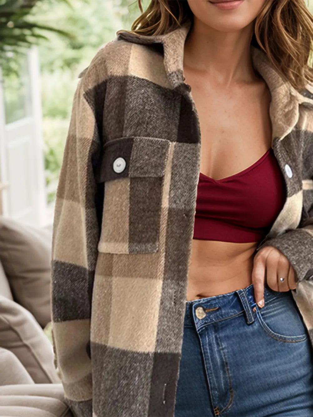 Home/Women Trench Coats/Plaid Button Up Long Sleeve Shacket