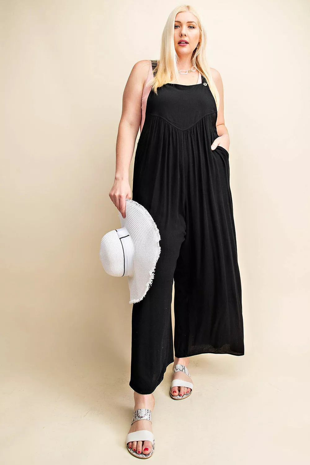 The sleeveless ruched wide leg overalls are a trendy and comfortable option for a fashion-forward look. With their sleeveless design, they provide a cool and breezy feel, perfect for warmer days. The ruched detailing adds a touch of texture and visual interest, enhancing the overall style of the overalls. The wide leg silhouette offers a relaxed and flowy fit, allowing for freedom of movement. Crafted from a soft and breathable fabric, these overalls are ideal for casual outings or lounging around. Pair them with a simple t-shirt or a cropped top for an effortlessly chic and laid-back look. Embrace the fashion-forward appeal of the sleeveless ruched wide leg overalls and elevate your style with their unique and trendy design.