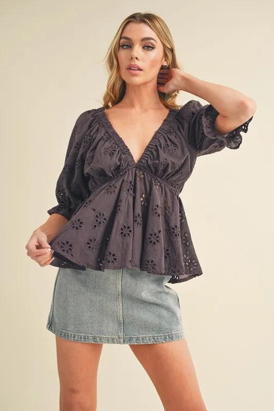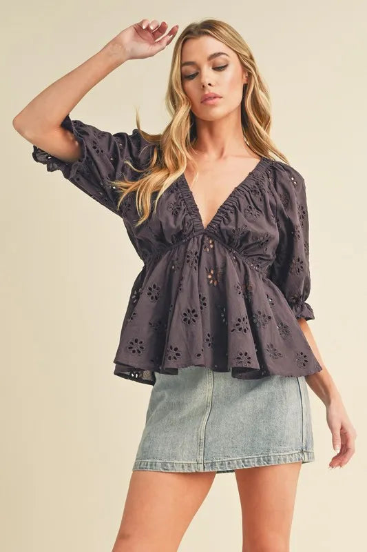 Aemi + Co Eyelet Embroidered V-Neck Half Sleeve Peplum Blouse