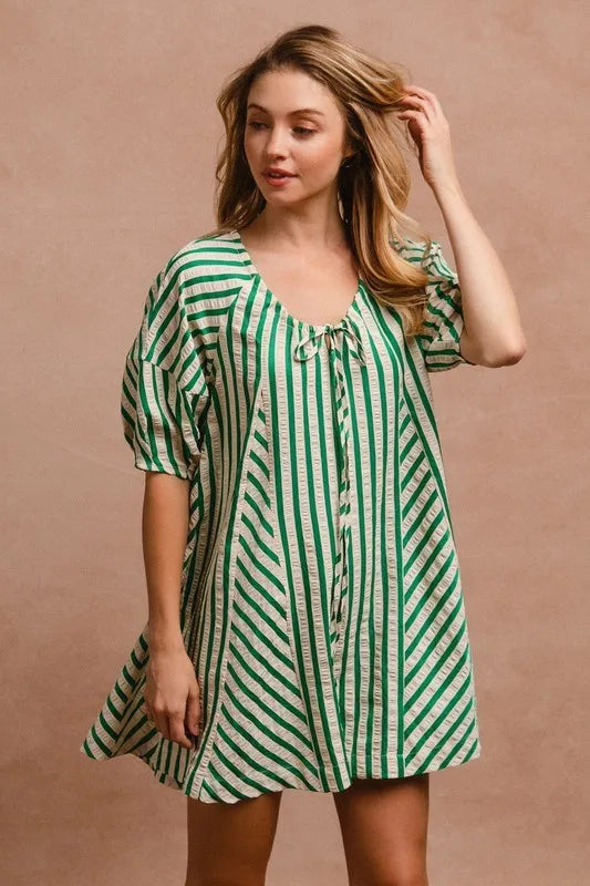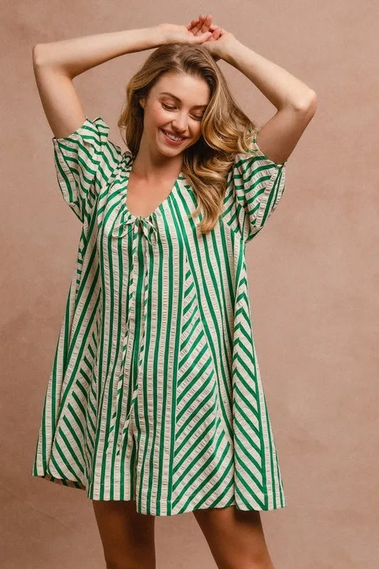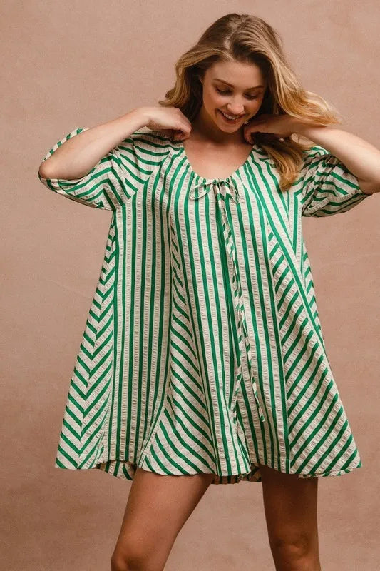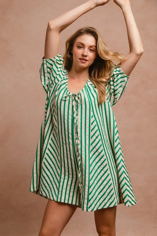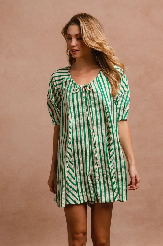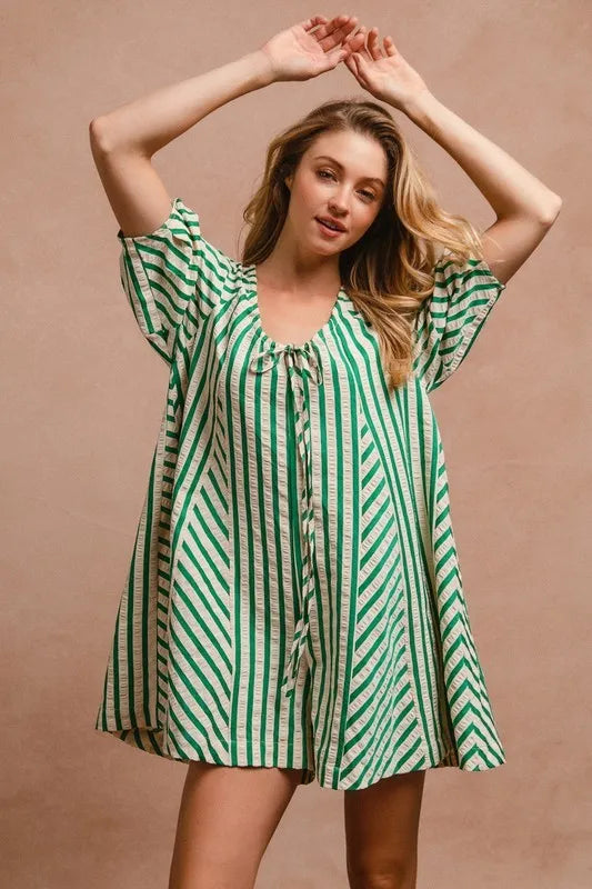 This romper showcases puffy sleeves for a touch of whimsical charm and style. The back button closure adds a unique detail and makes it easy to slip on and off. With its combination of playful design elements and practical features, this romper is perfect for a variety of occasions, from casual outings to special events where you want to look effortlessly chic.