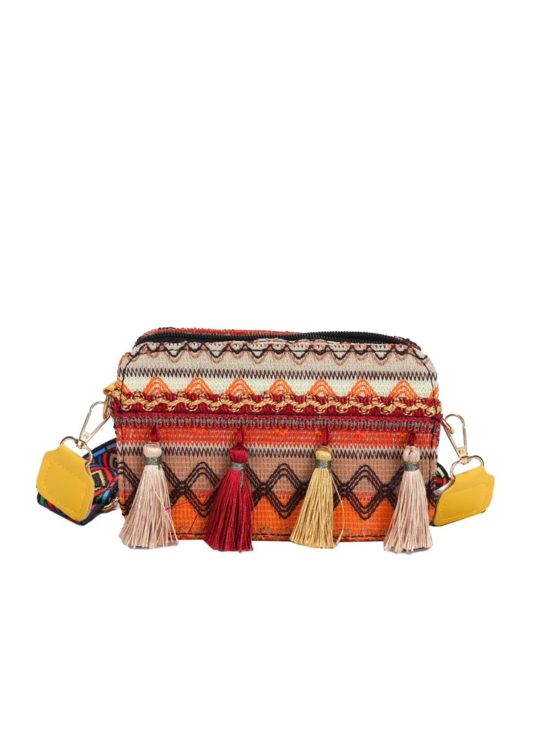 Bohemian Tassel Trim Crossbody Bag with Ethnic Pattern