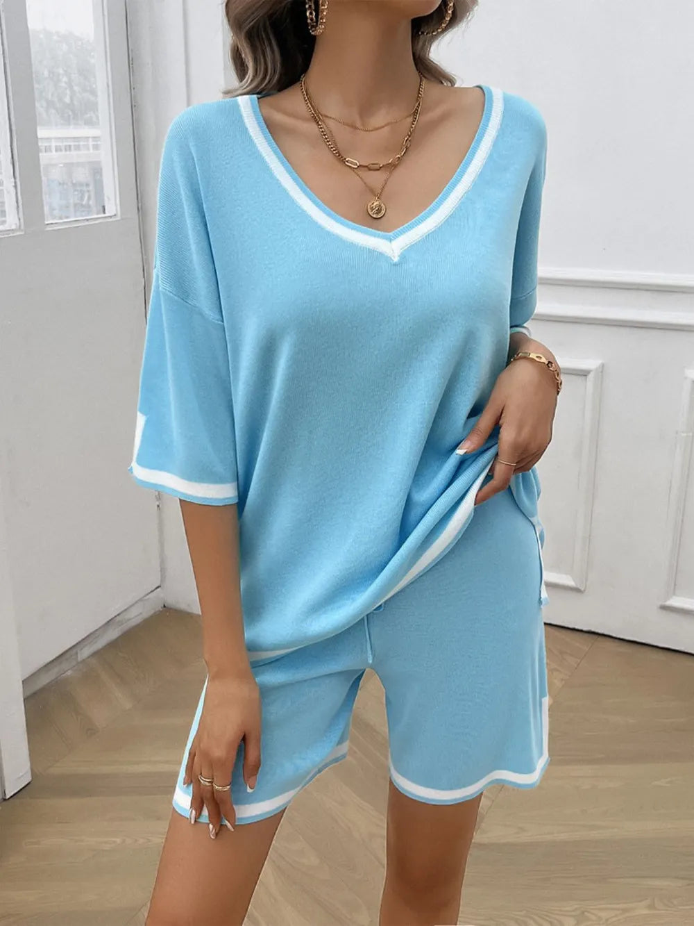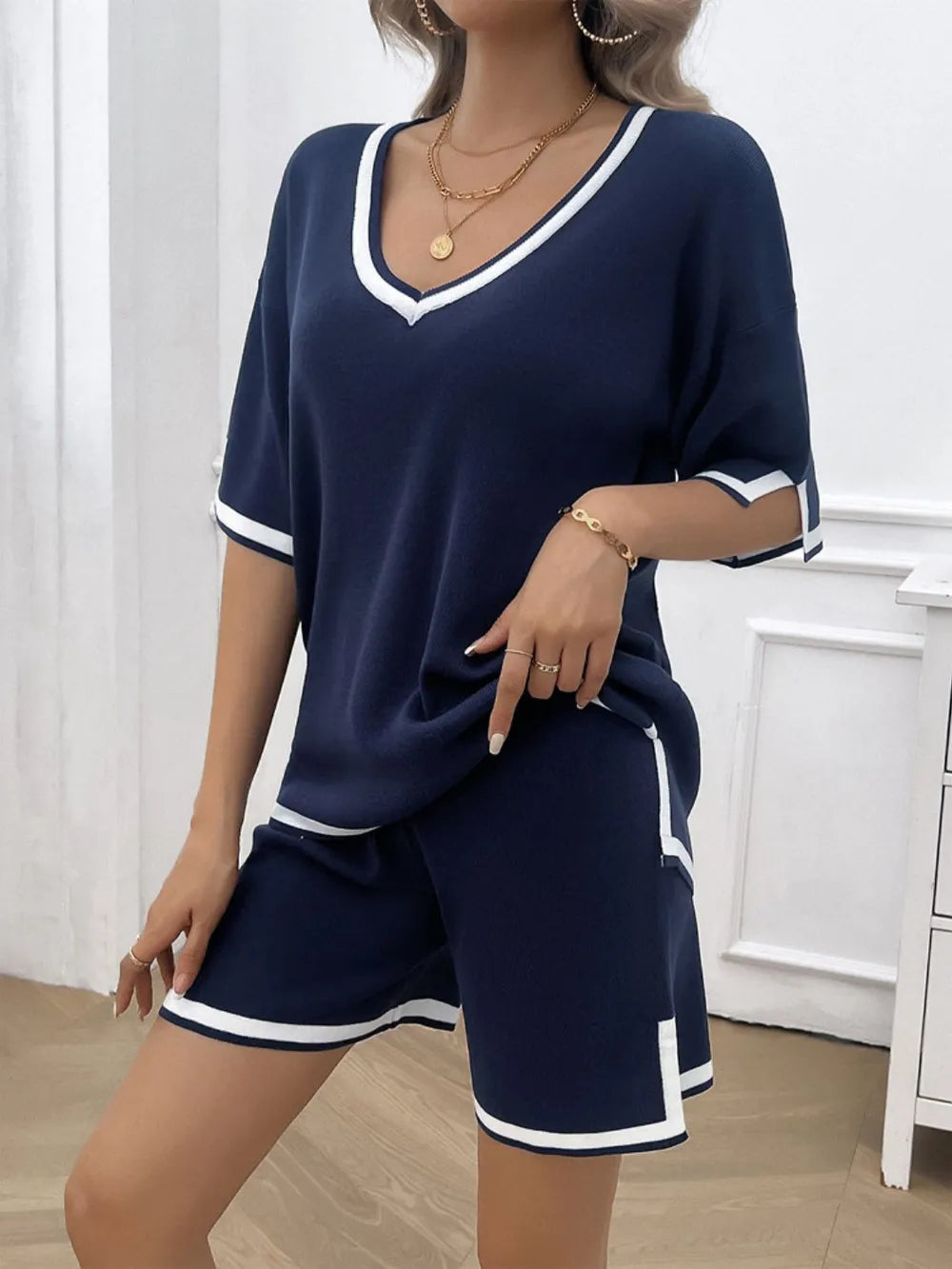 Devine Contrast Trim V-Neck Top and Shorts Set