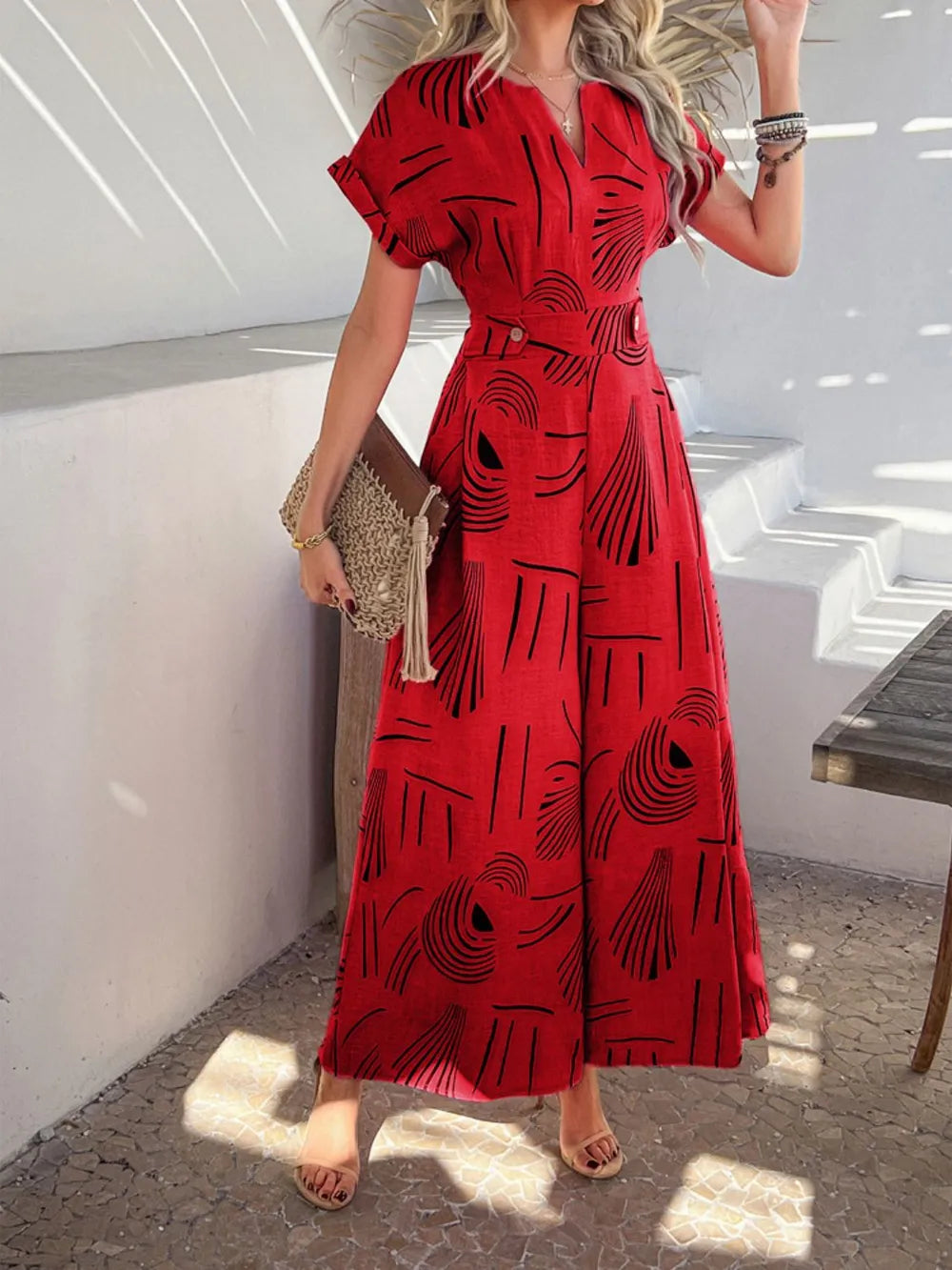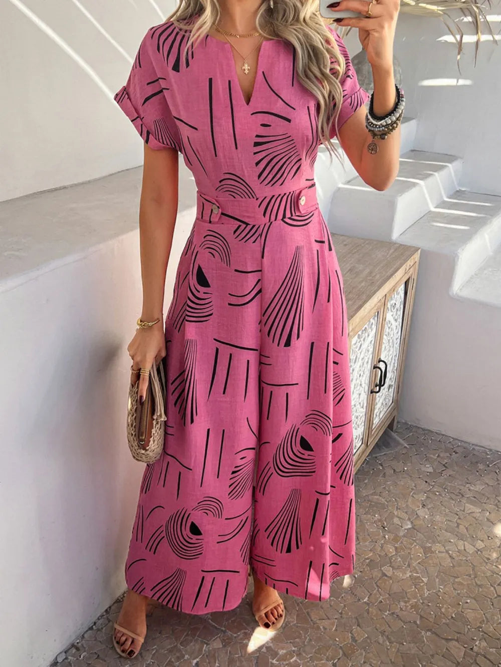 Devine Printed Notched Short Sleeve Wide Leg Jumpsuit