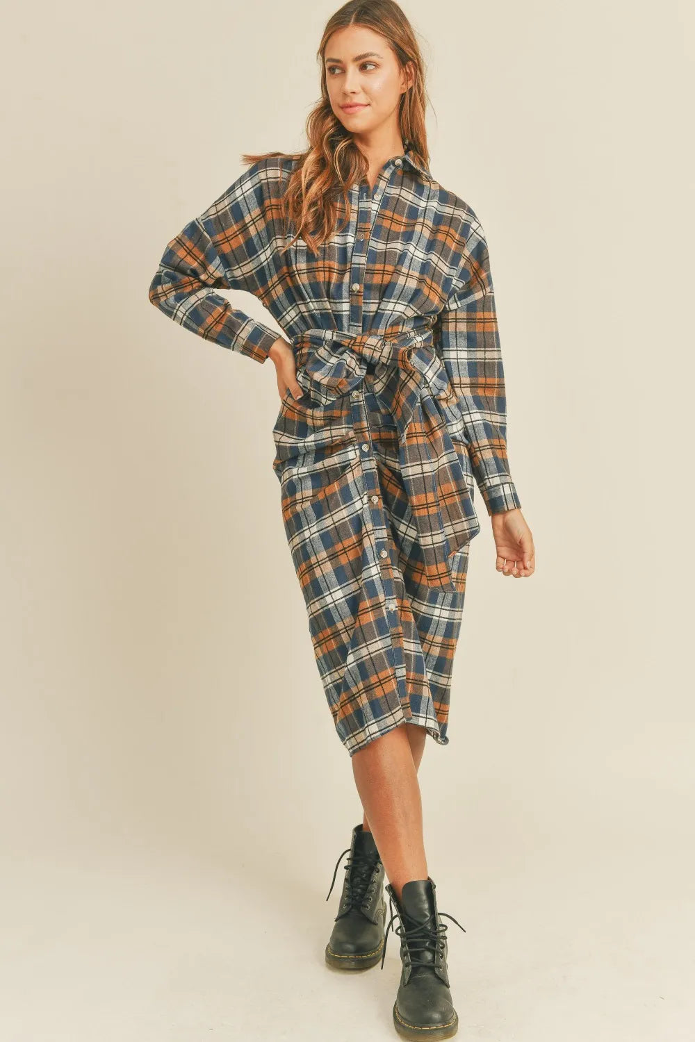 Mable Plaid Flannel Front Tie Button Down Shirt Dress